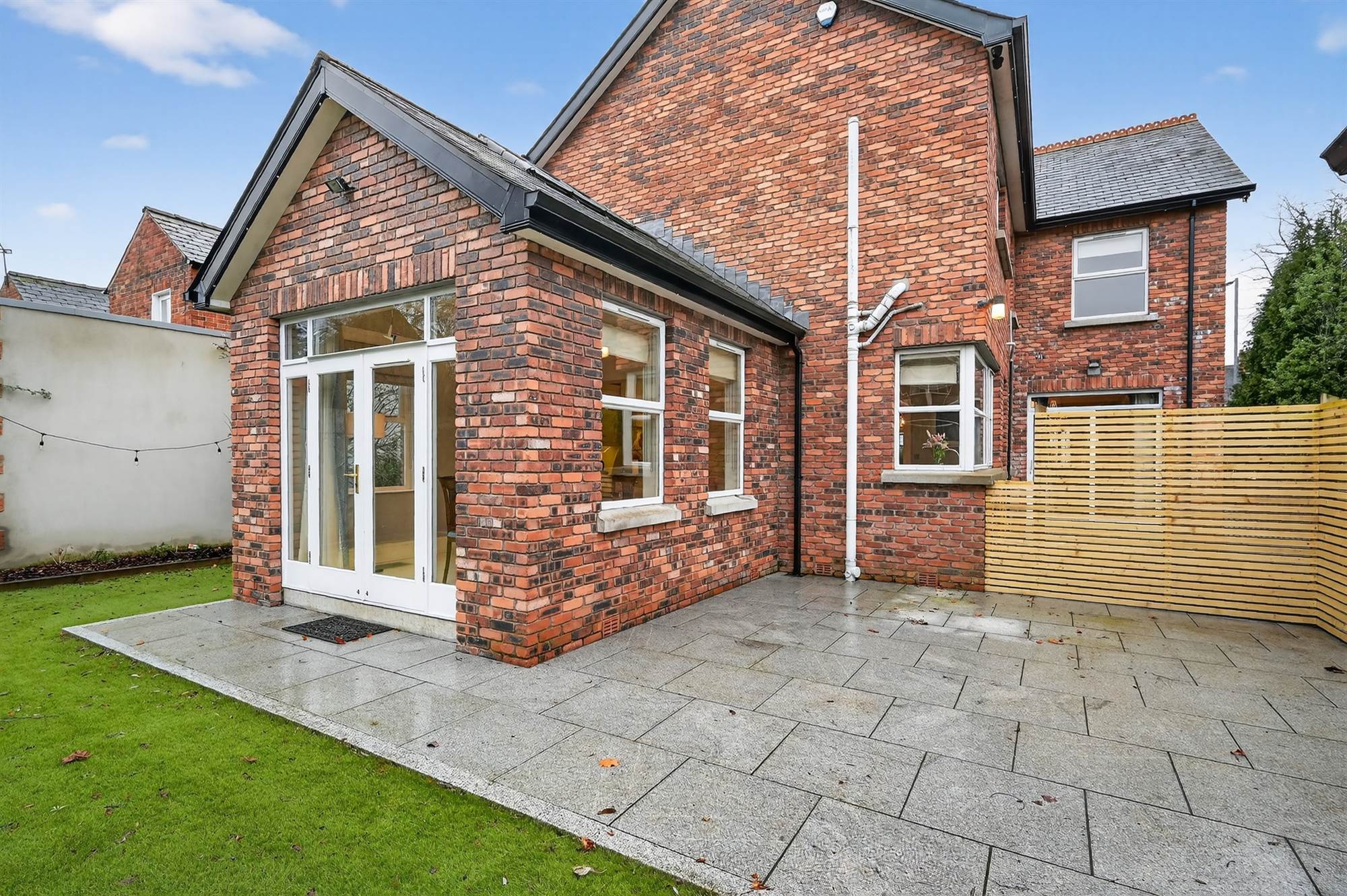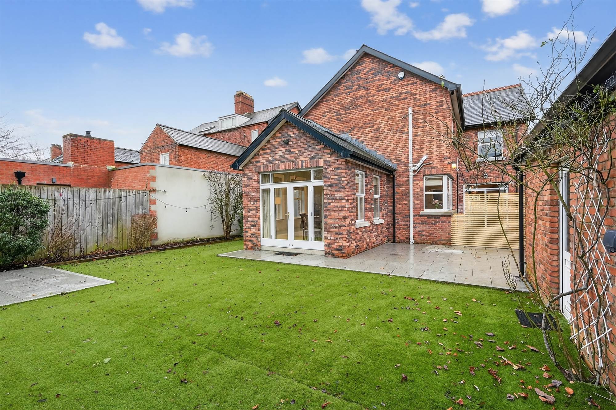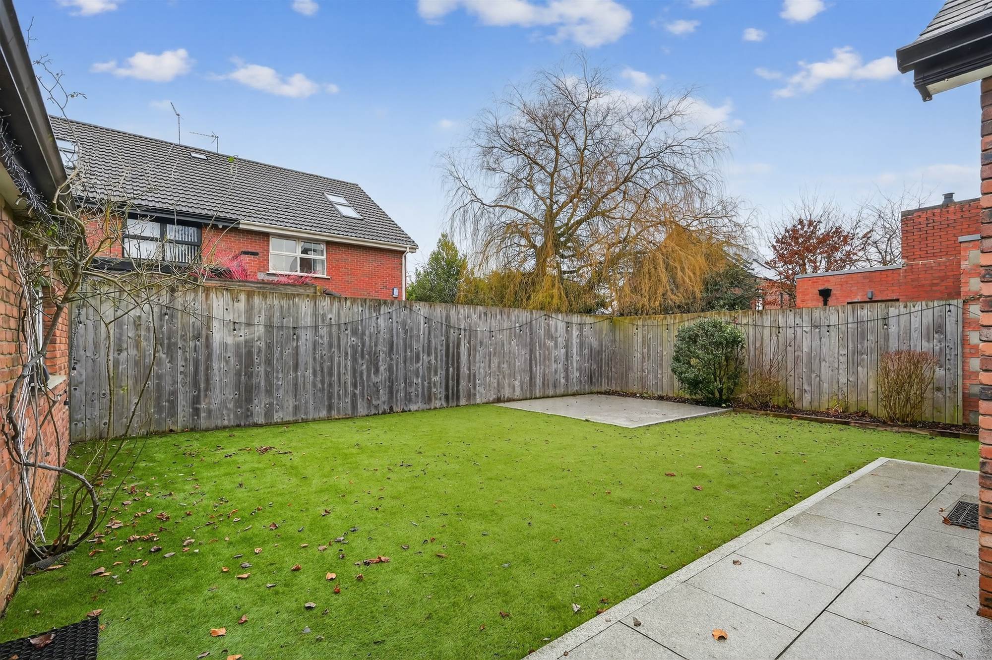 Enclosed landscaped rear garden with artificial grass and paved patio areas ideal for barbecues and outdoor entertaining
