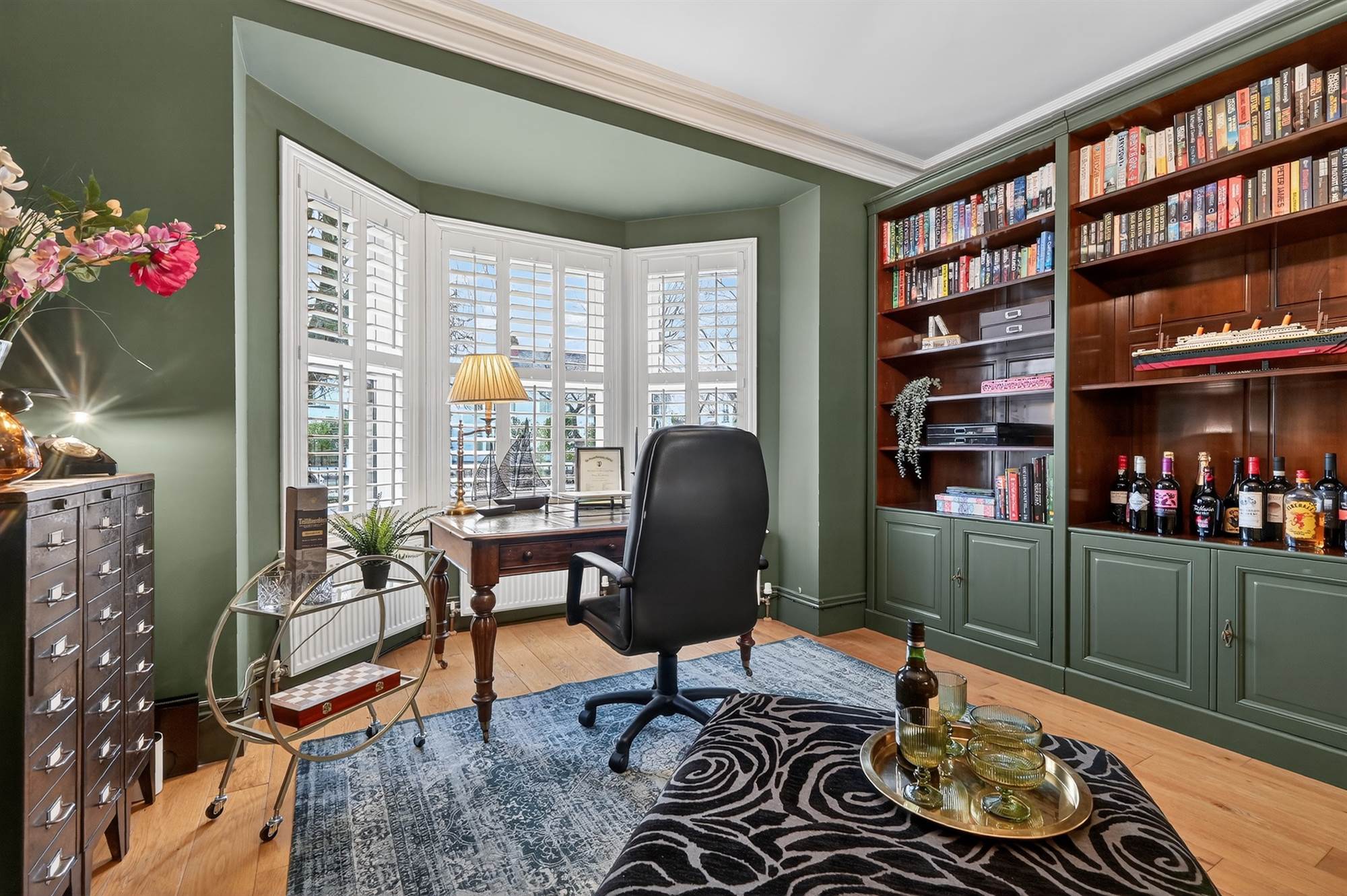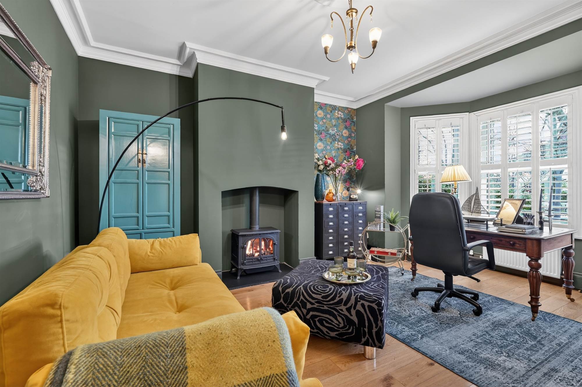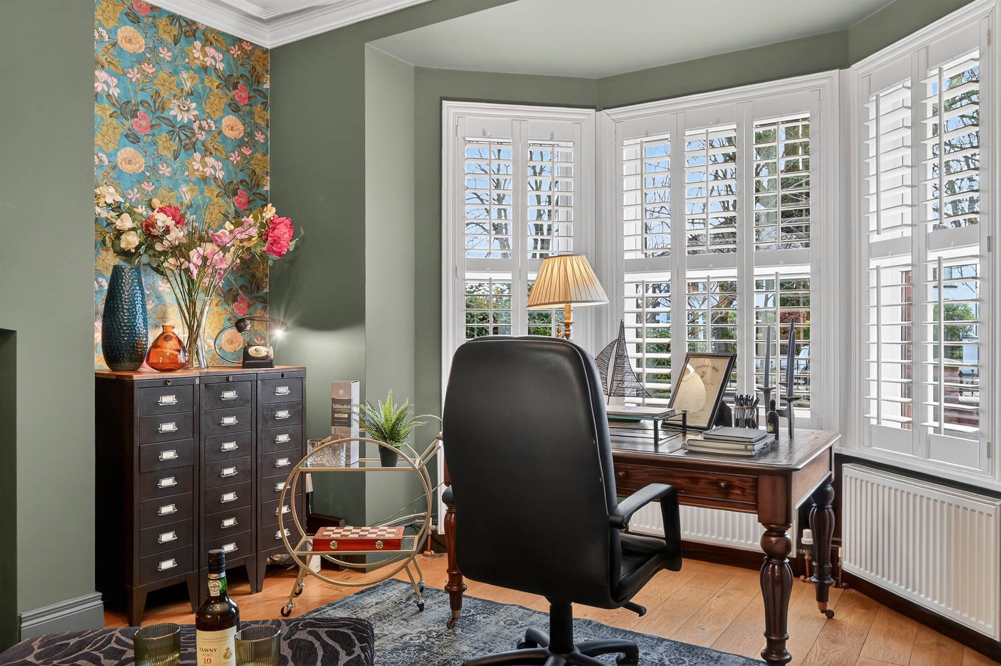 (Measurements into bay window). Oak wooden floor, bespoke built-in French shutters, cast iron gas stove with slate hearth, cornice ceiling, ceiling rose.