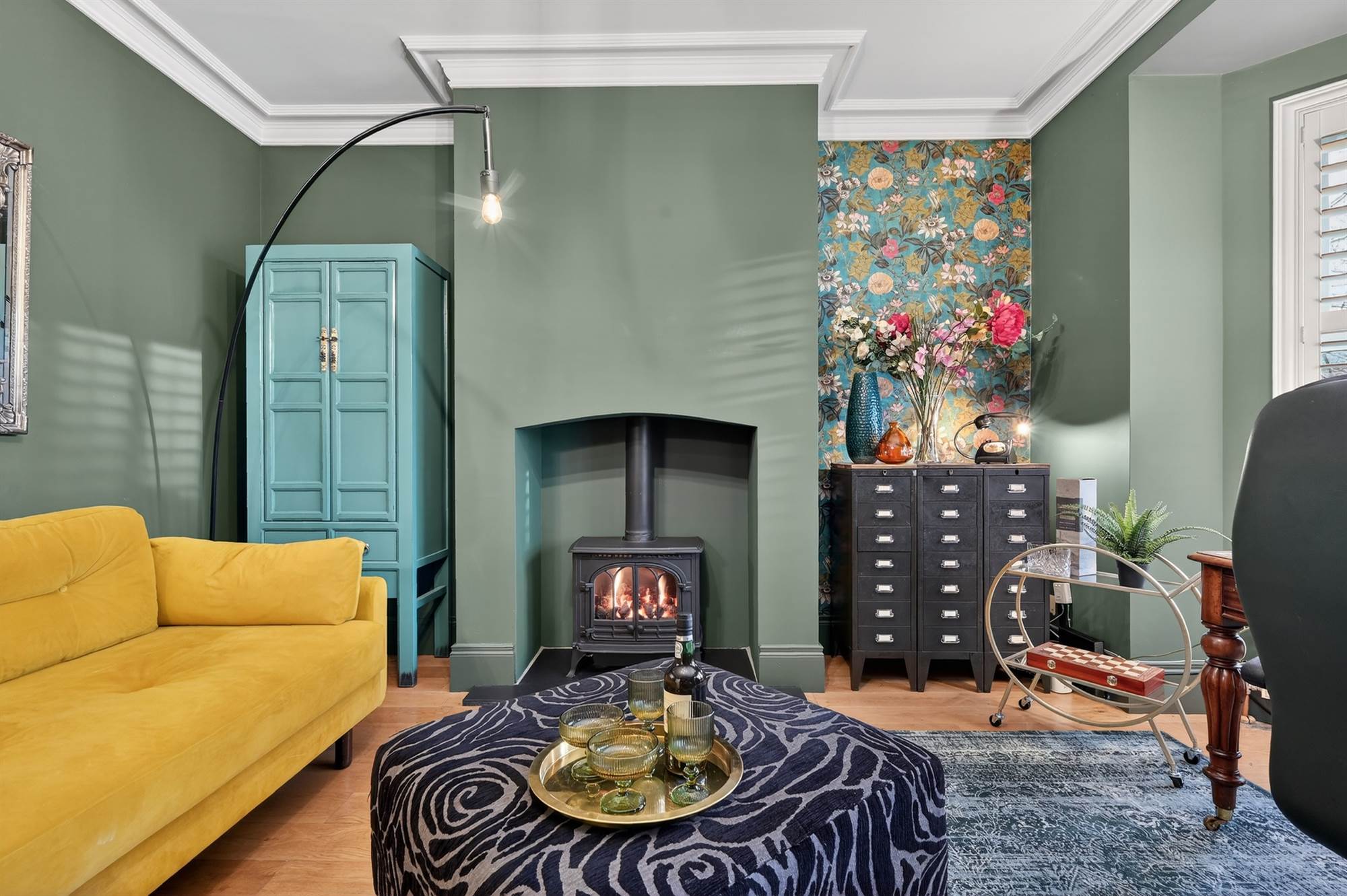 Drawing room with oak wooden floor and cast iron gas stove