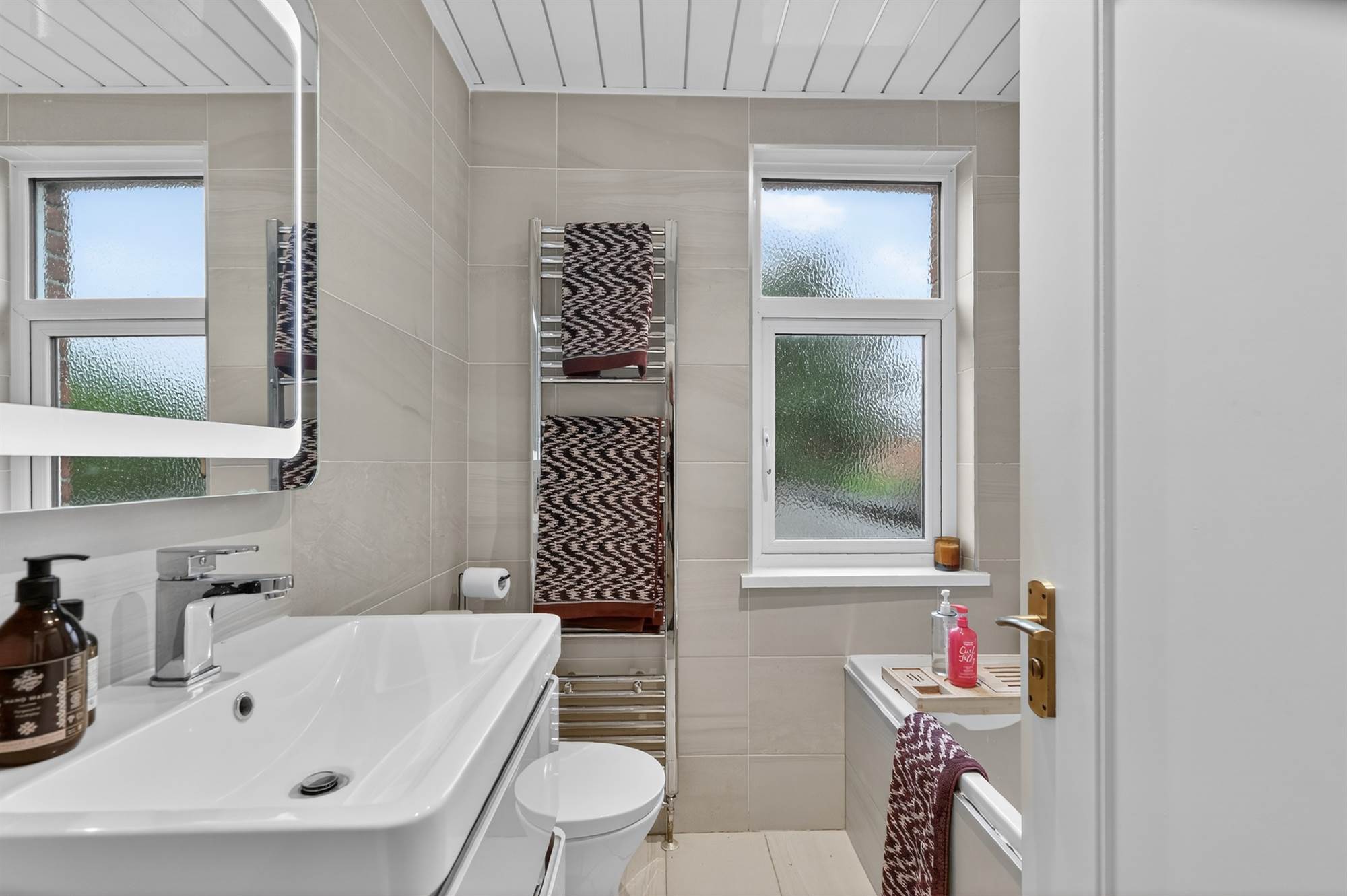 White suite comprising low flush WC, vanity unit with wash hand basin, panelled bath with telephone shower over, ceramic tiled floor, tongue and groove ceiling, low voltage spotlighting, extractor fan, heated towel rail.