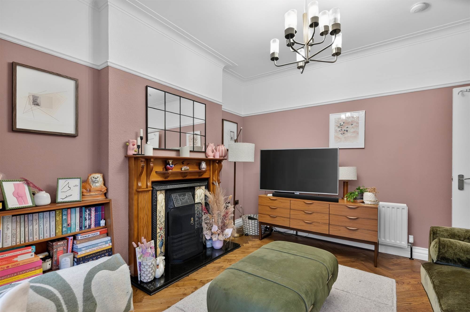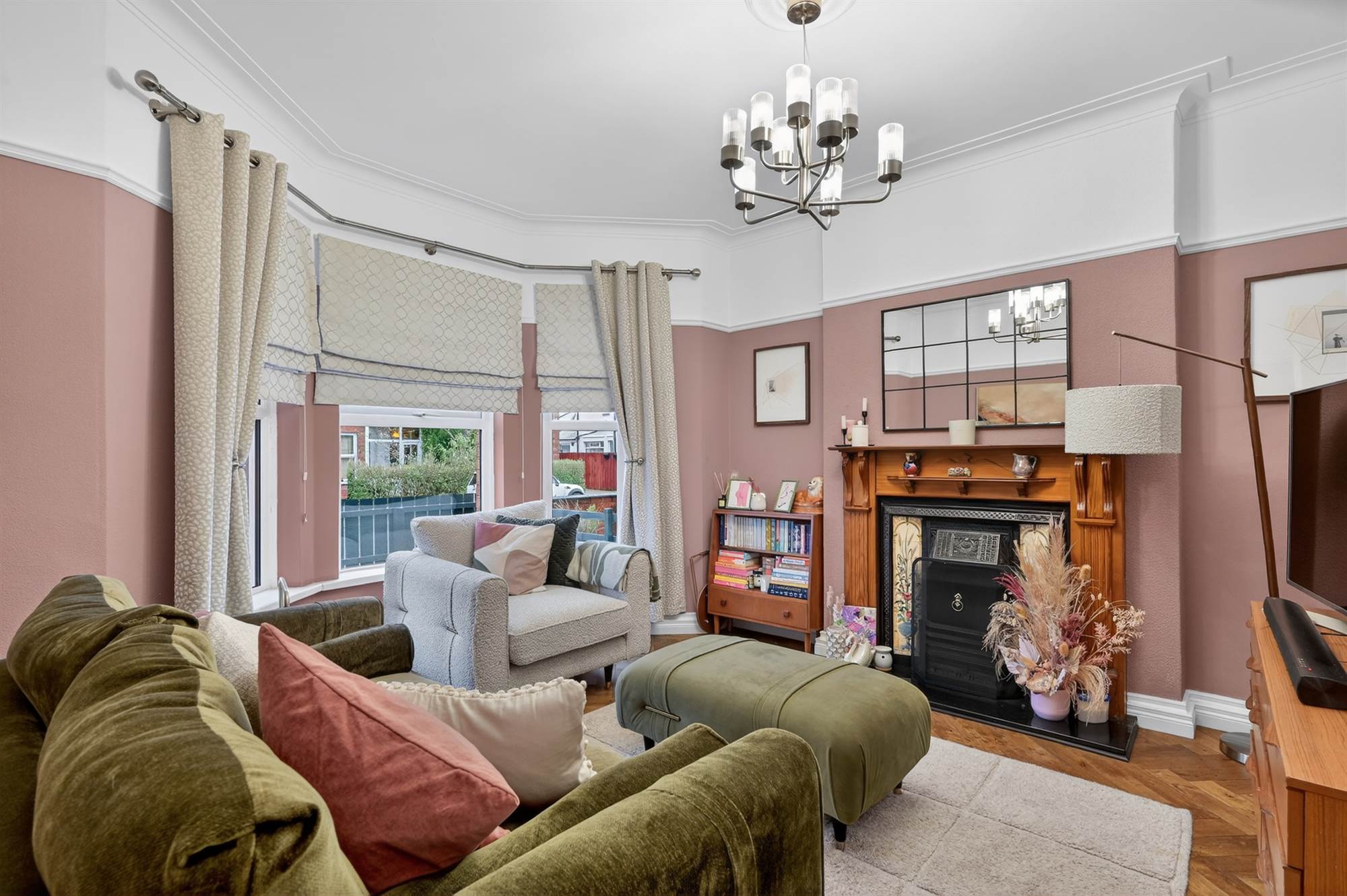 Attractive fireplace with cast iron inset and tiled grate hearth, bay window, herringbone floor, cornice ceiling, ceiling rose, panelled walls.