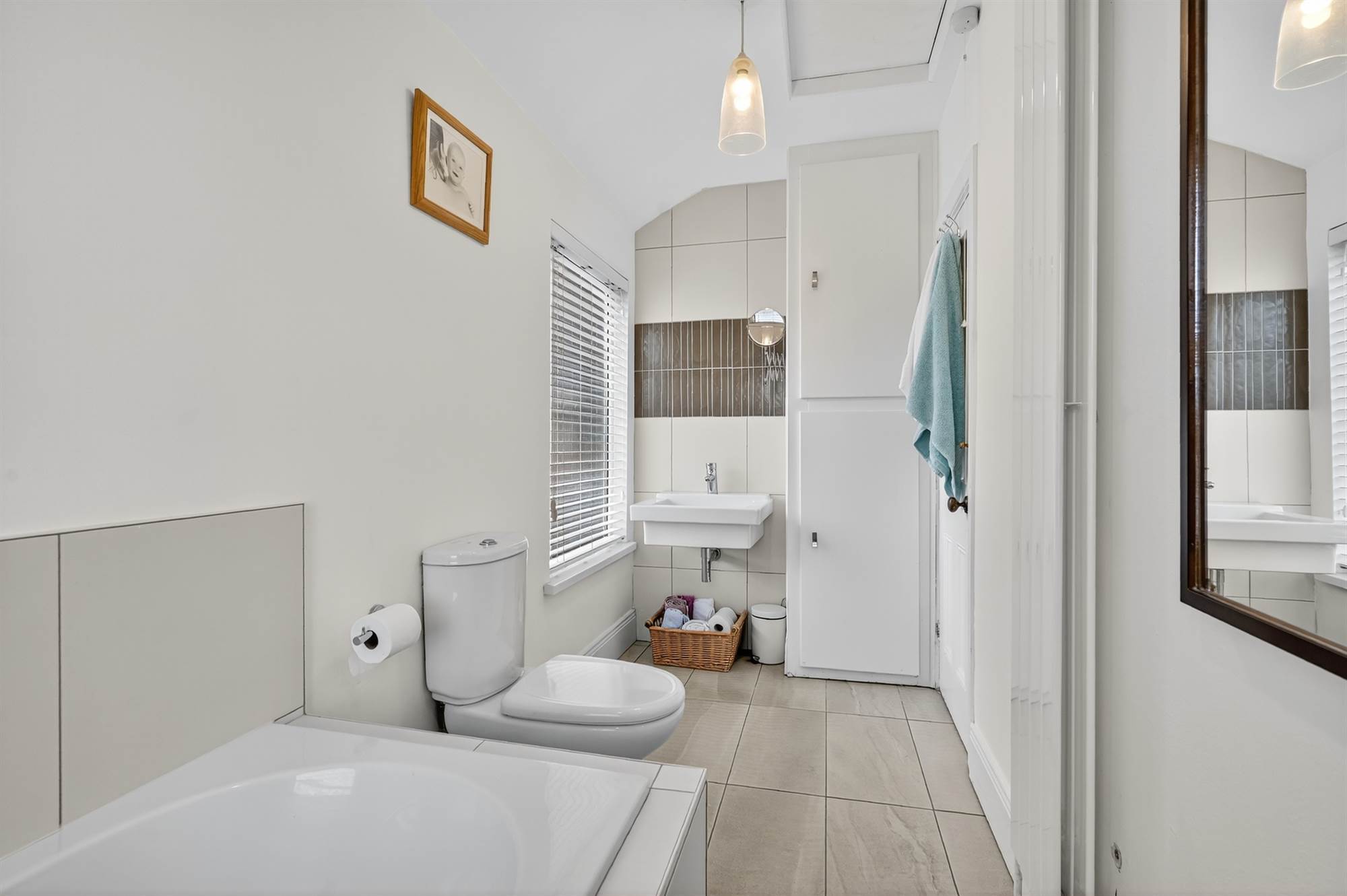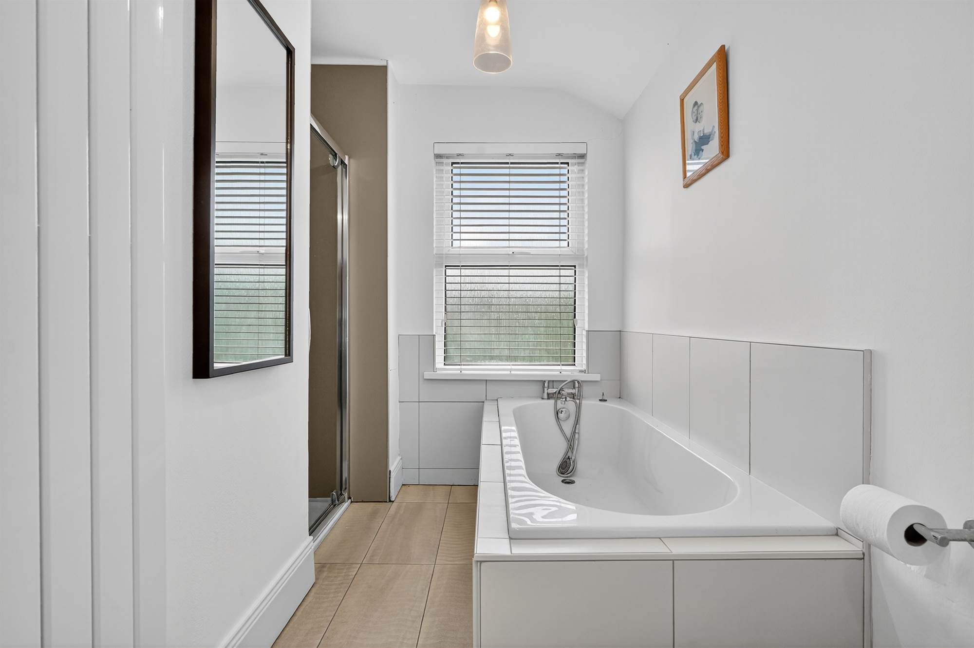 Tiled panelled bath, mixer taps, low flush wc, wash hand basin, ceramic tiled floor, part tiled walls, shower cubicle.