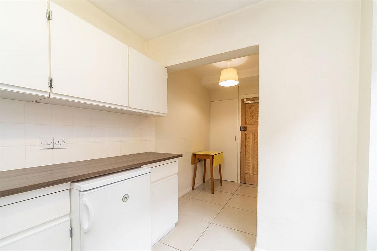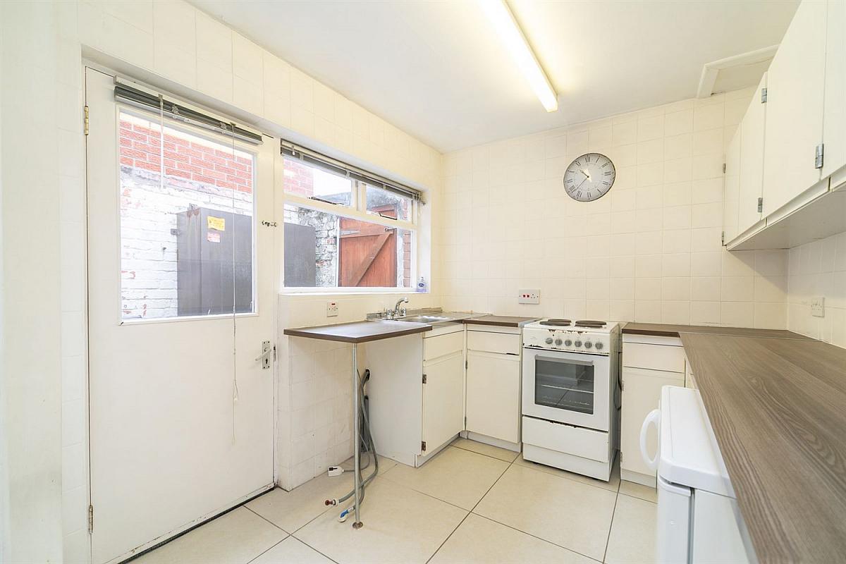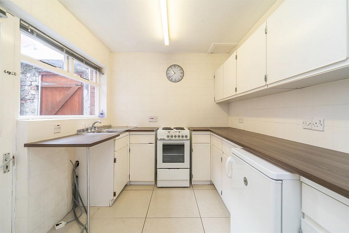 Range of hight and low cupboards, Formica work surface, single drainer stainless steel sink unit and mixer taps. Door to yard, tiled floor and larder cupboard.