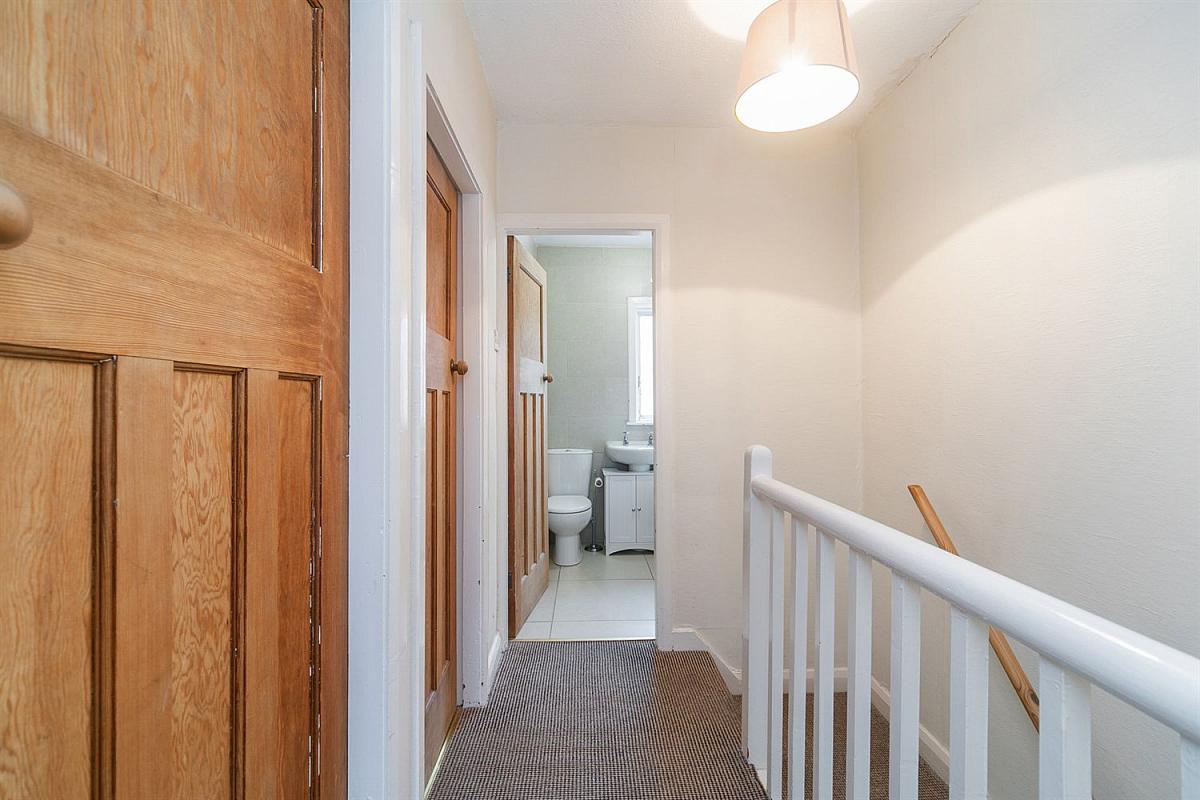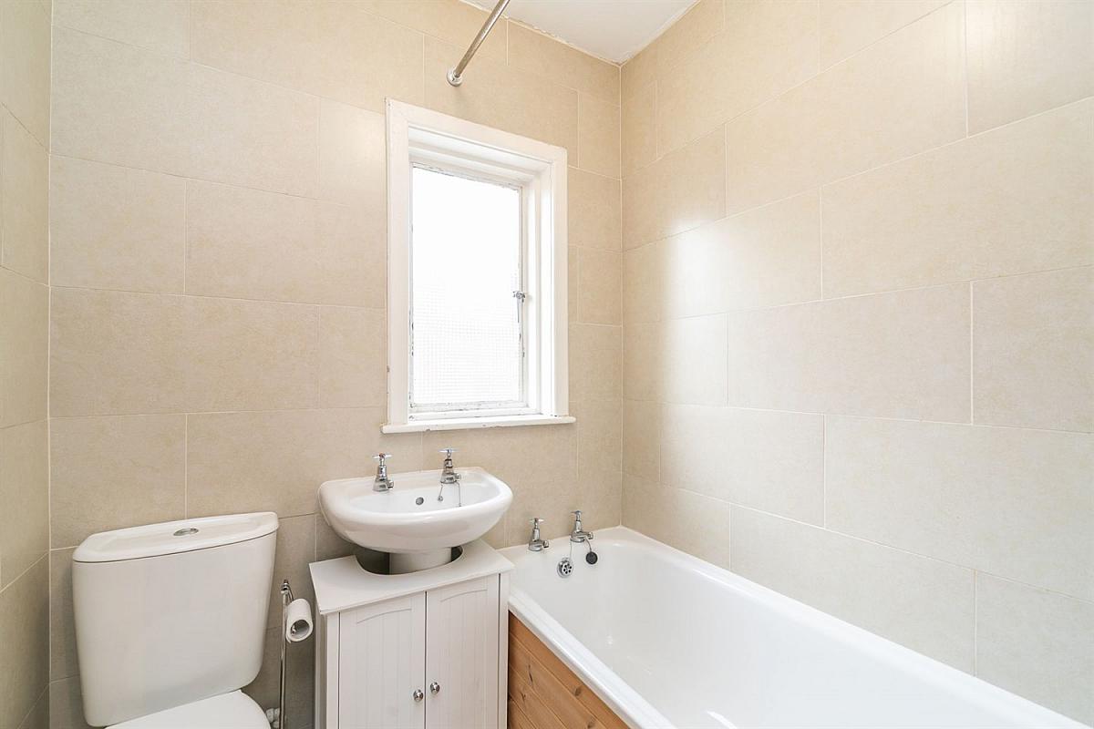White suite, Panelled bath with electric shower over, pedestal wash hand basin, close coupled W.C. Tiled walls and floor.