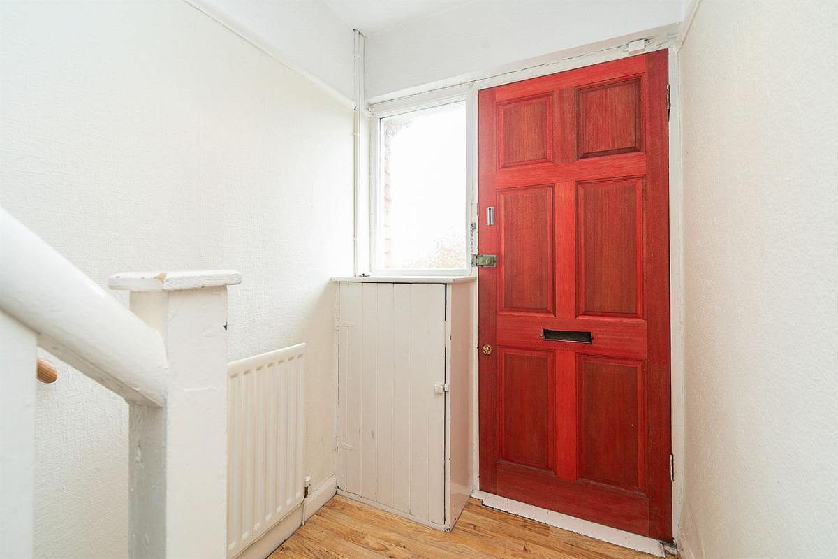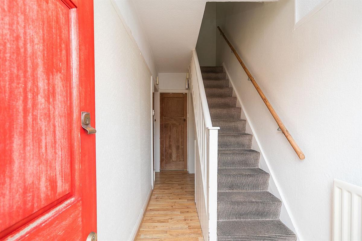 Hardwood entrance door, laminate wood strip floor. Storage area under stairs.
