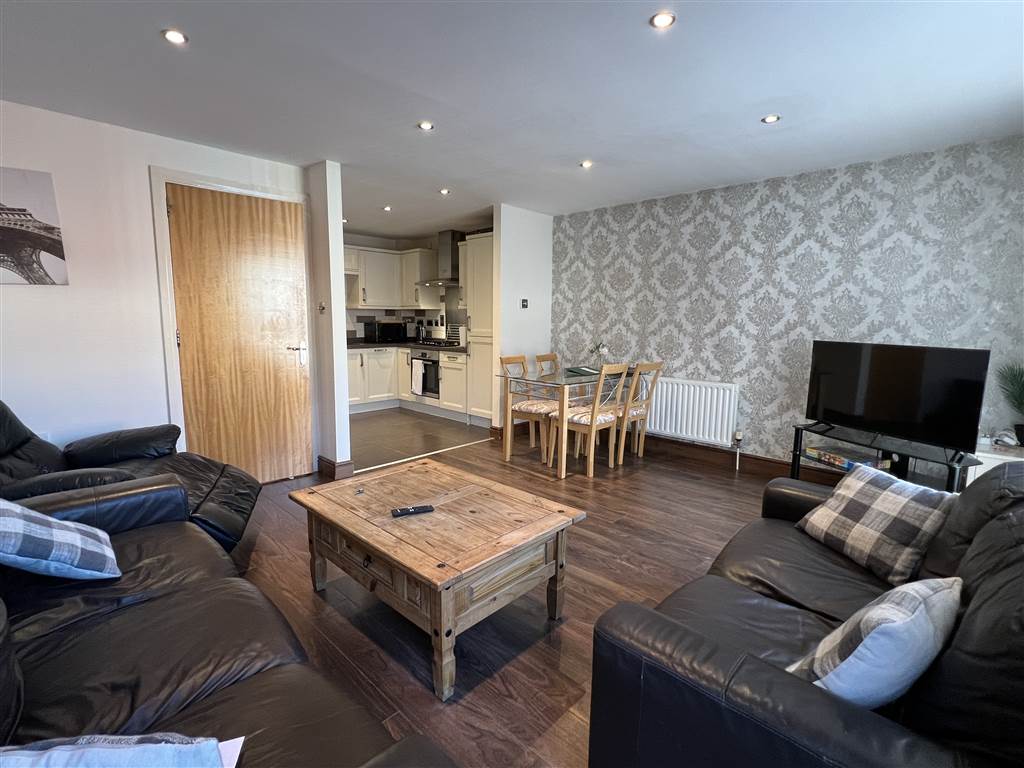 Upon entry, you're welcomed by a hallway with handy built-in storage. The open-plan kitchen, living, and dining area is generously sized, featuring integrated appliances and access to a private balcony. On the same entrance level you will also find two well-sized bedrooms, with one including built-in storage, and a luxurious main shower room.