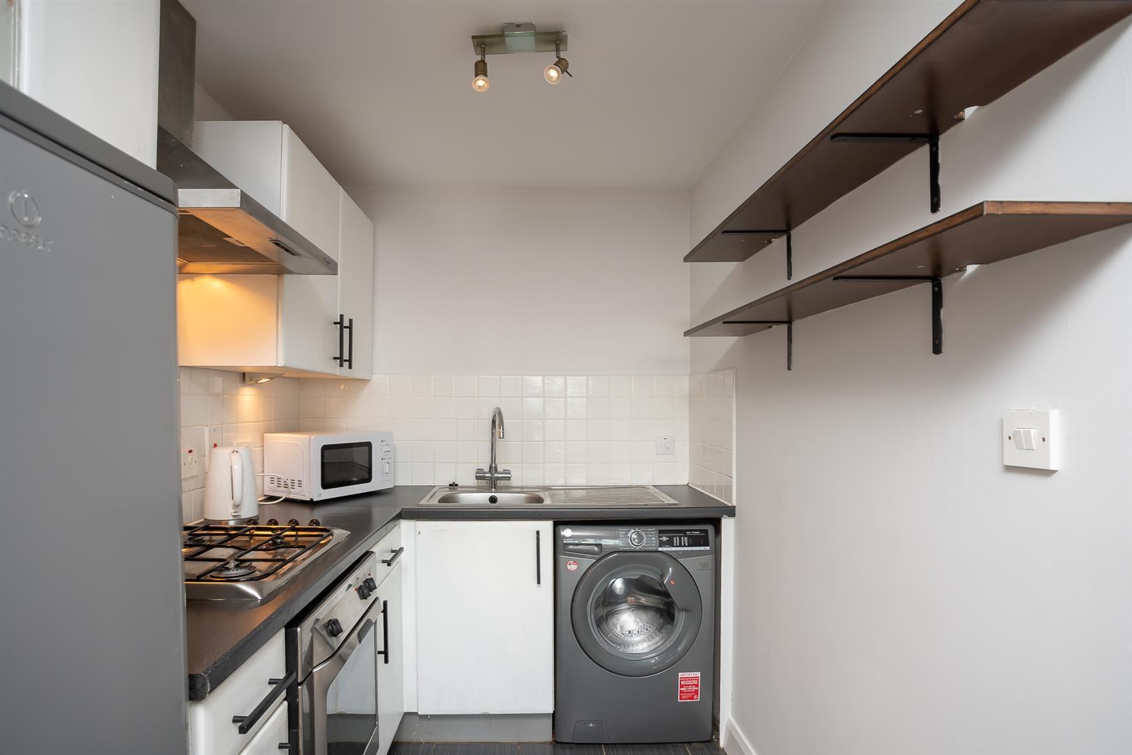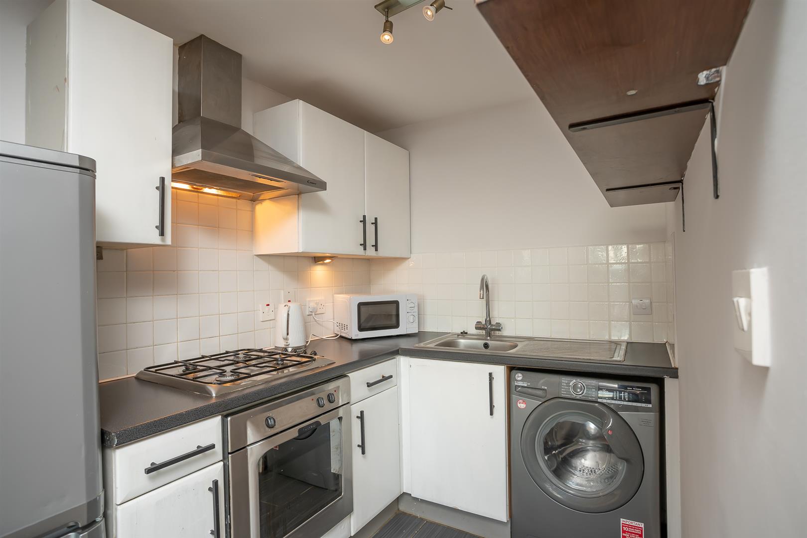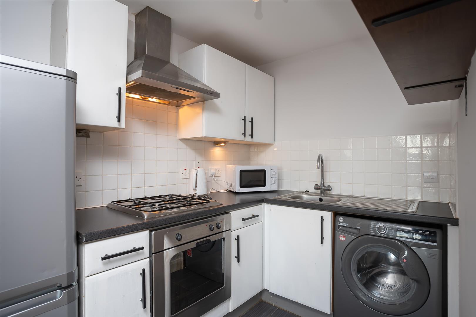 Small 'L shaped' kitchen, with tiled floor, gas hob and oven, space for fridge and plumbed for white goods, partially tiled walls.