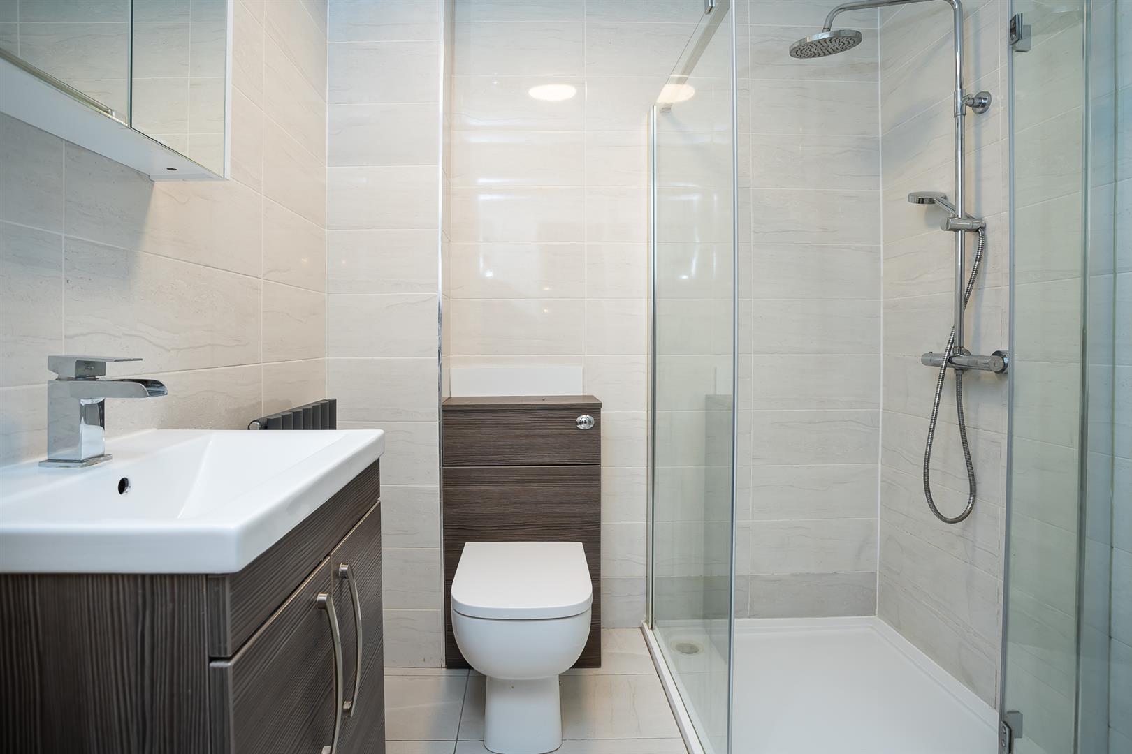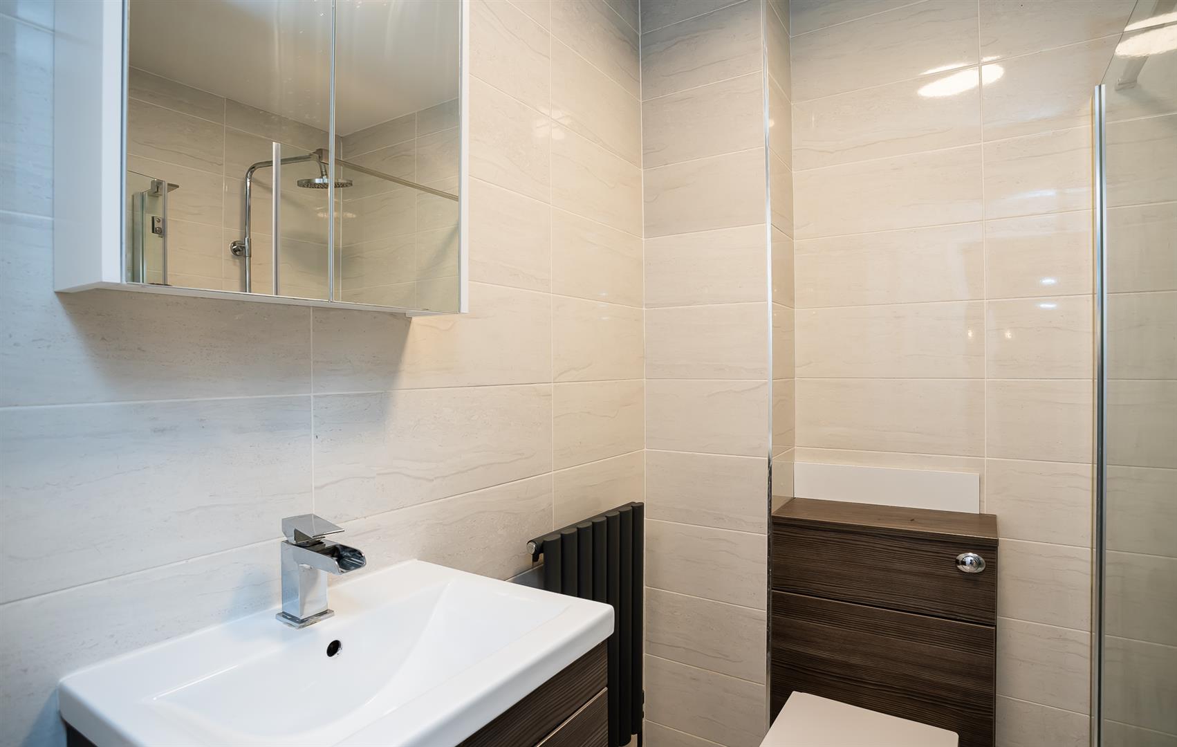 Low flush W/C, shower over bath, pedestal sink, partially tiled