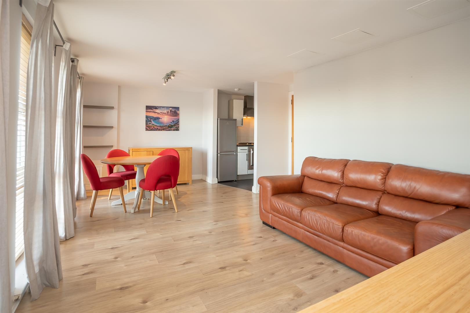 A large open plan living/dining area with laminate flooring and uPVC windows leading to kitchen