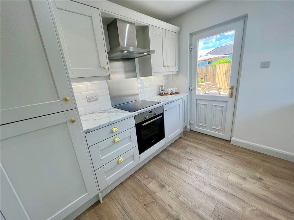 High and low level units, plumbed for dish washer, built in oven and hob, integrated fridge/freezer. Stainless steel extractor fan and splash back. 1 1/2 stainless steel sink unit with mixer tap.