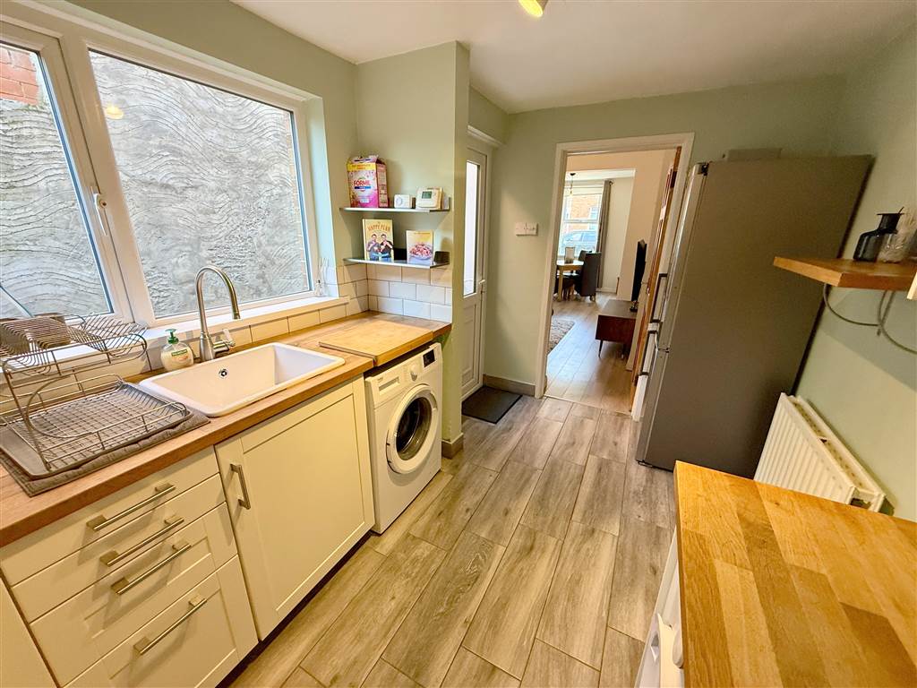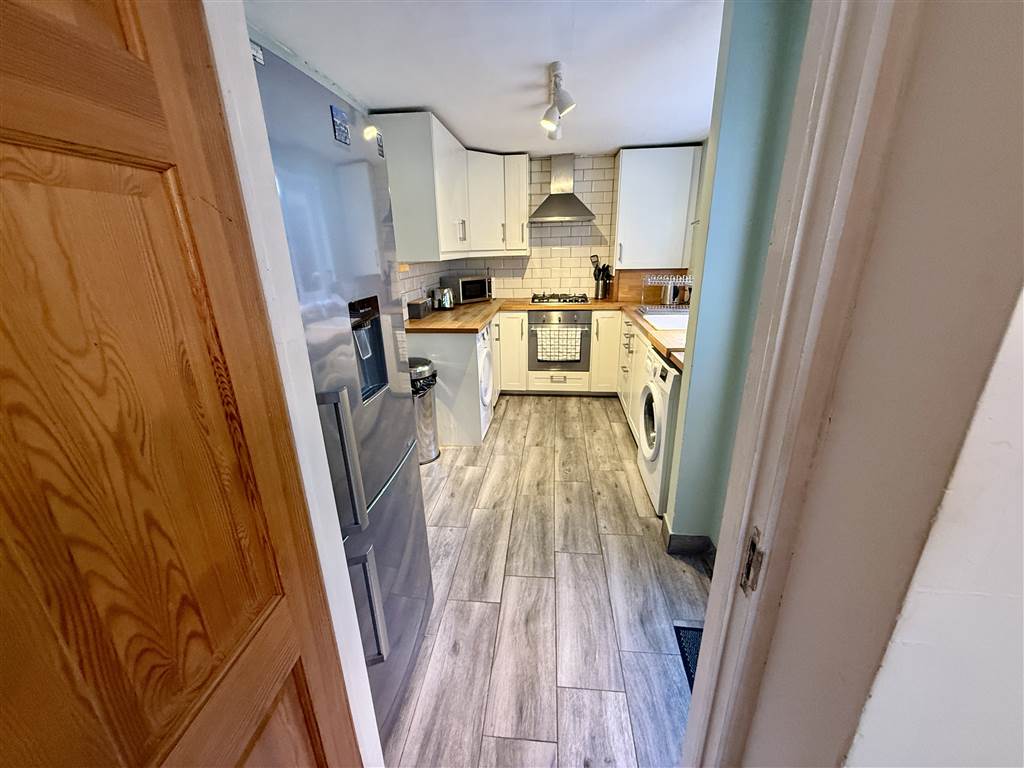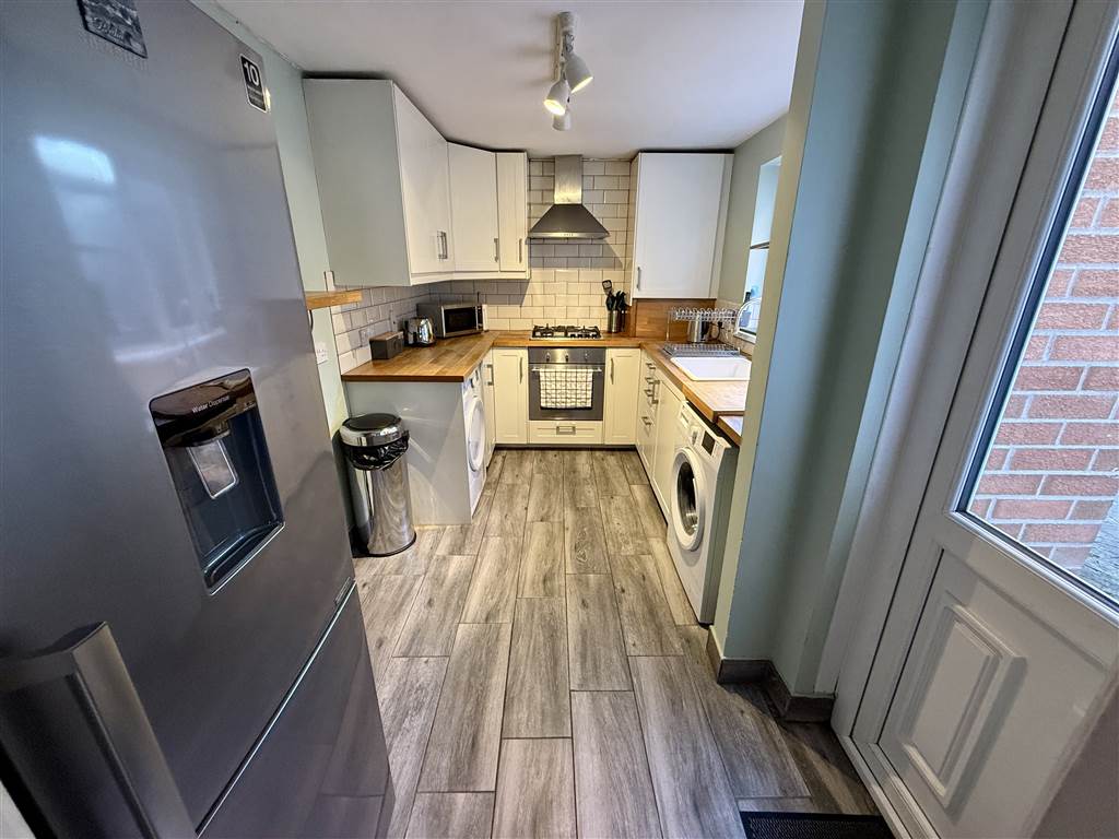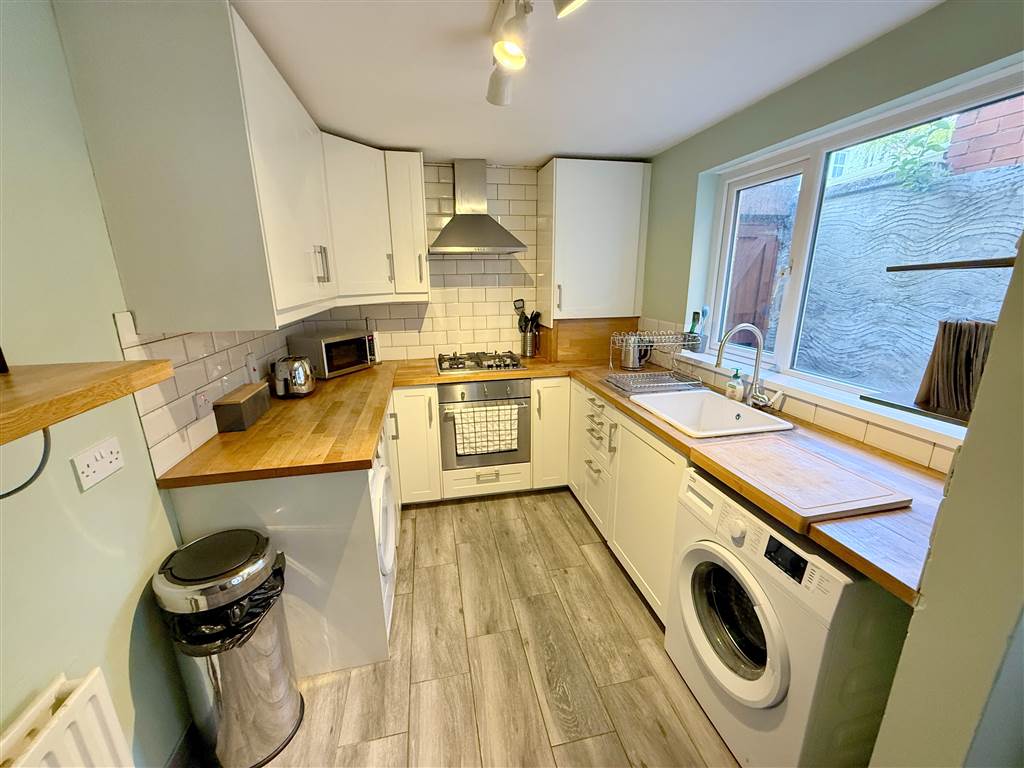 Range of high and low level units with woodent worktops. Built in oven, hob and extractor fan. Sink with drainer. Plumbed for washing machine. Part tiled walls. Access to rear.
