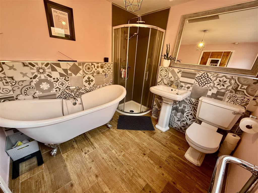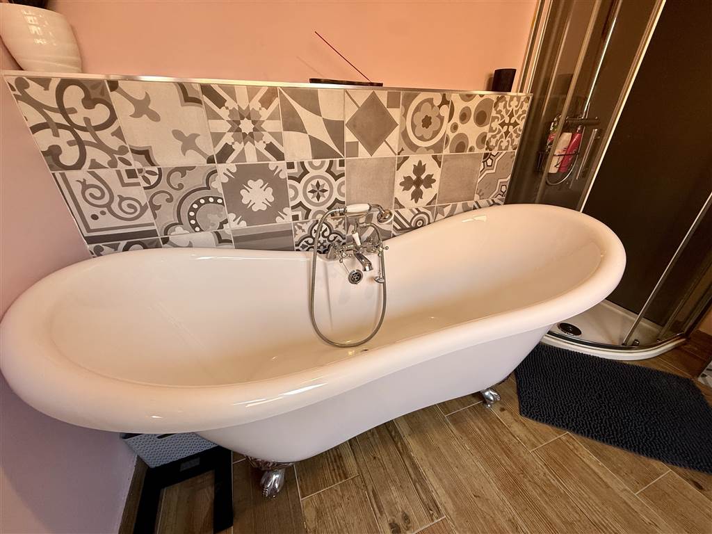 White suite: Roll top free standing bath, walkin shower , pedestal wash hand basin, dual flush w.c. Tiled floor. Tiled walls.
