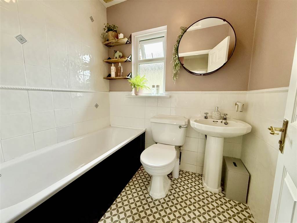 White suite: panel bath with thermostat shower, low flush w.c and pedestal wash hand basin, extractor fan