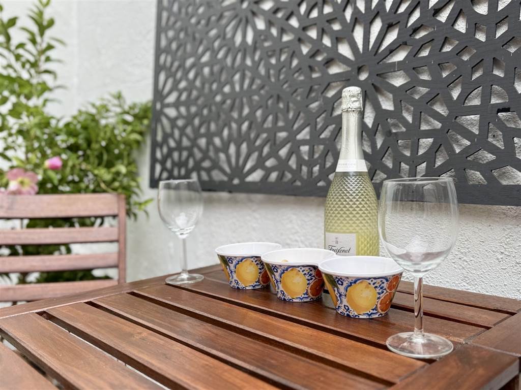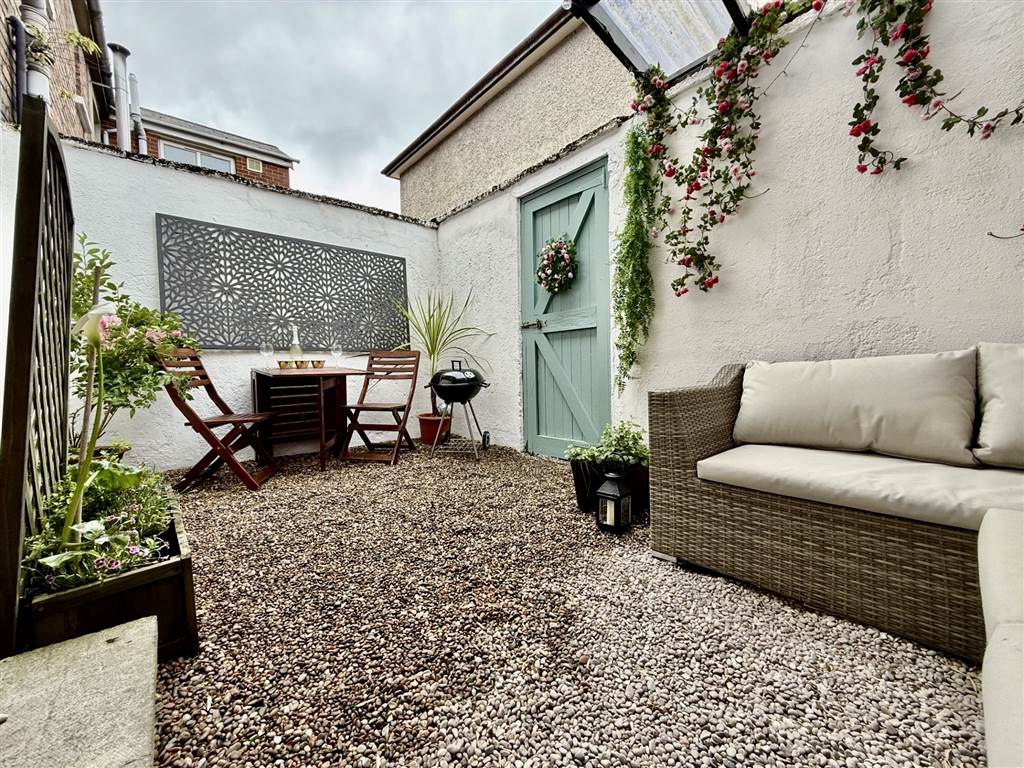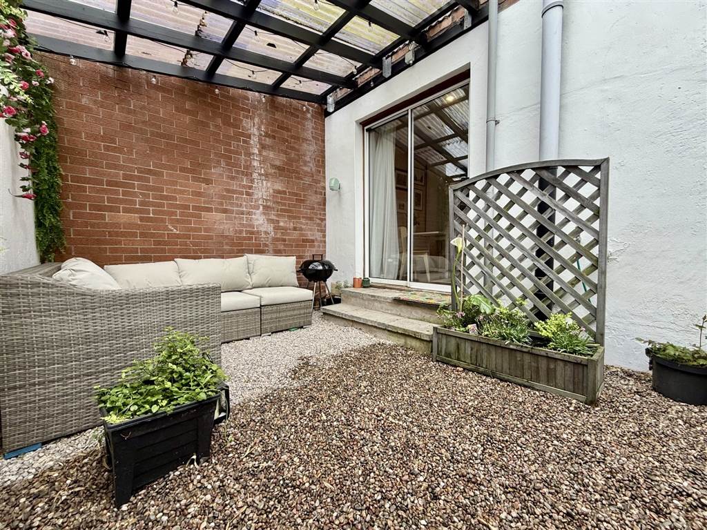 Enclosed and partially covered rear yard area. Rear festoon lights wired to mains