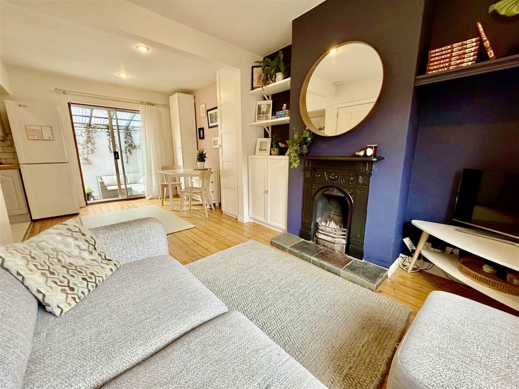 Through lounge with beautiful working cast iron fireplace . Ppatio doors leading to rear yard.