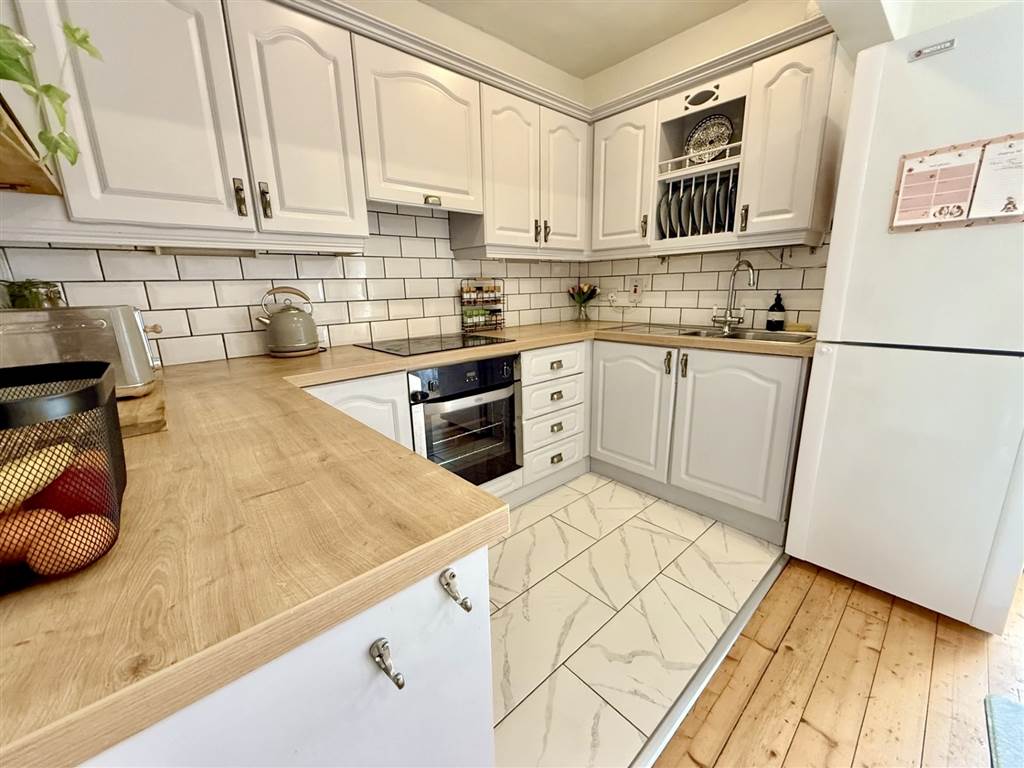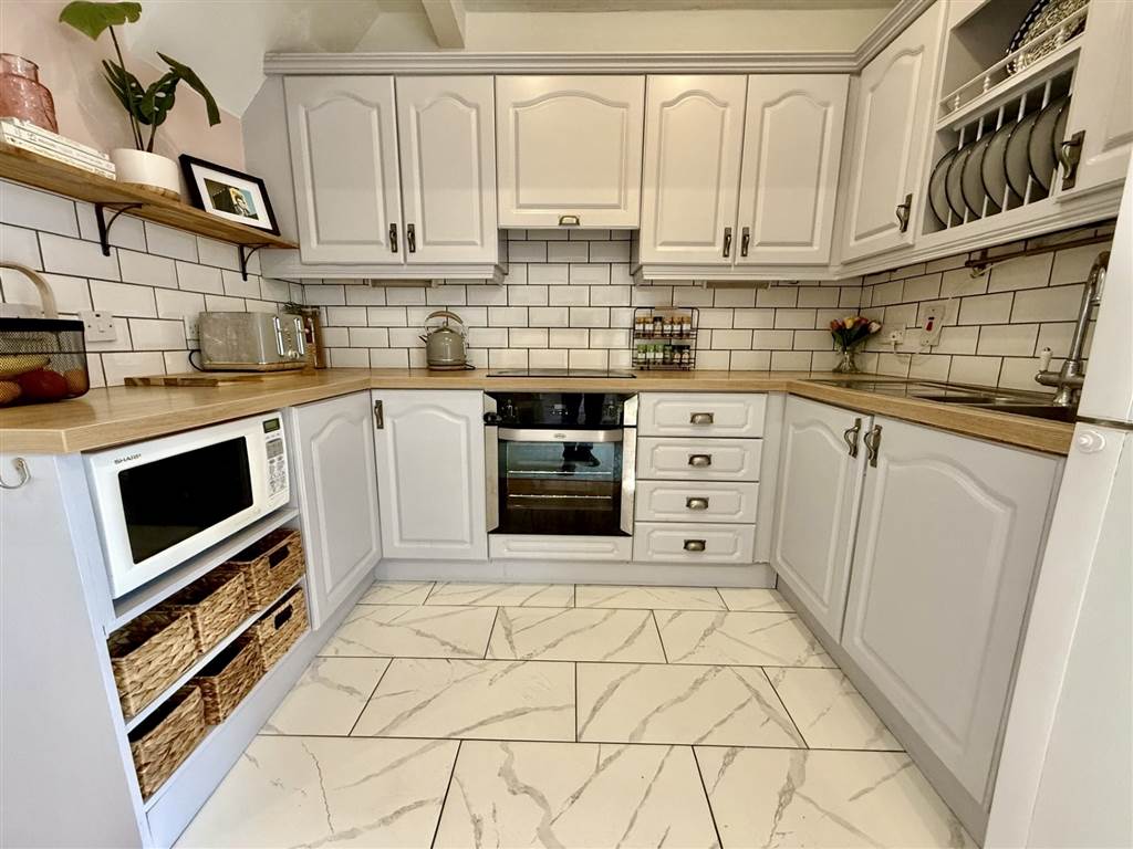 Range of high and low level units with wood effect worktops. Built in oven, hob and extractor fan.1 1/2 stainless steel sink with drainer. Tiled floor. Part tiled walls.