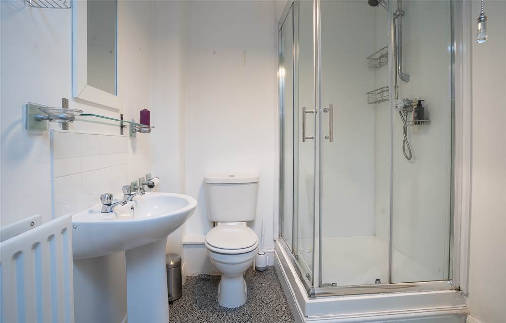 Three piece suite with corner shower with sliding doors and power showerhead, low flush W/C and wash hand basin.