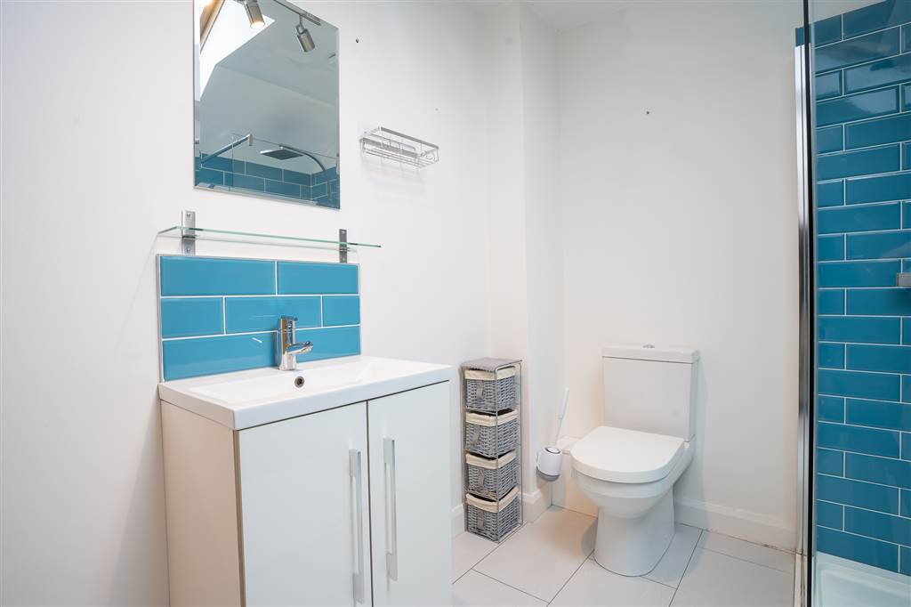 Double shower with glass panel, subway splashback tiling, wash hand basin and low flush W/C.