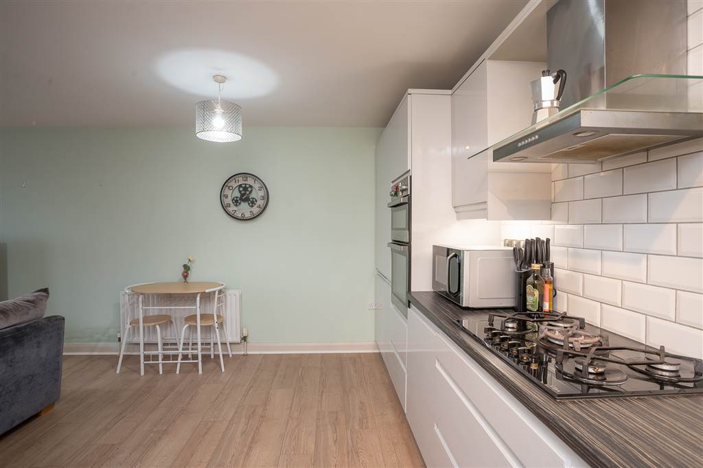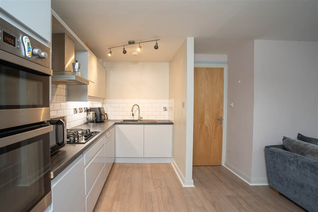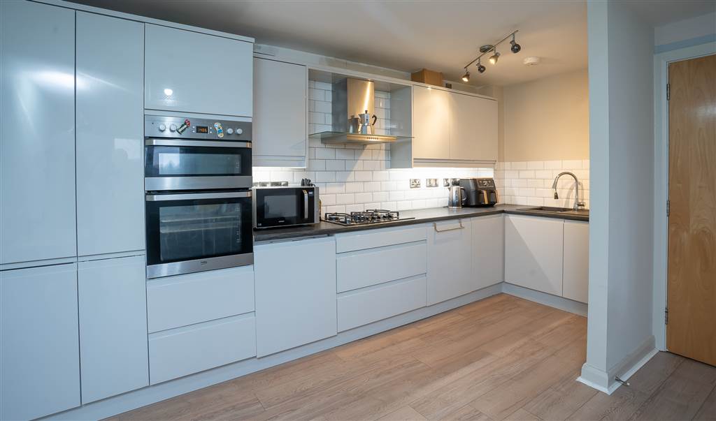 High and low level units with laminate work-surfaces, Beko integrated oven with gas hob with glass cooker hood, integrated fridge freezer and stainless steel sink and under-counter lighting. Lounge area has superb natural lighting and carpeted flooring.