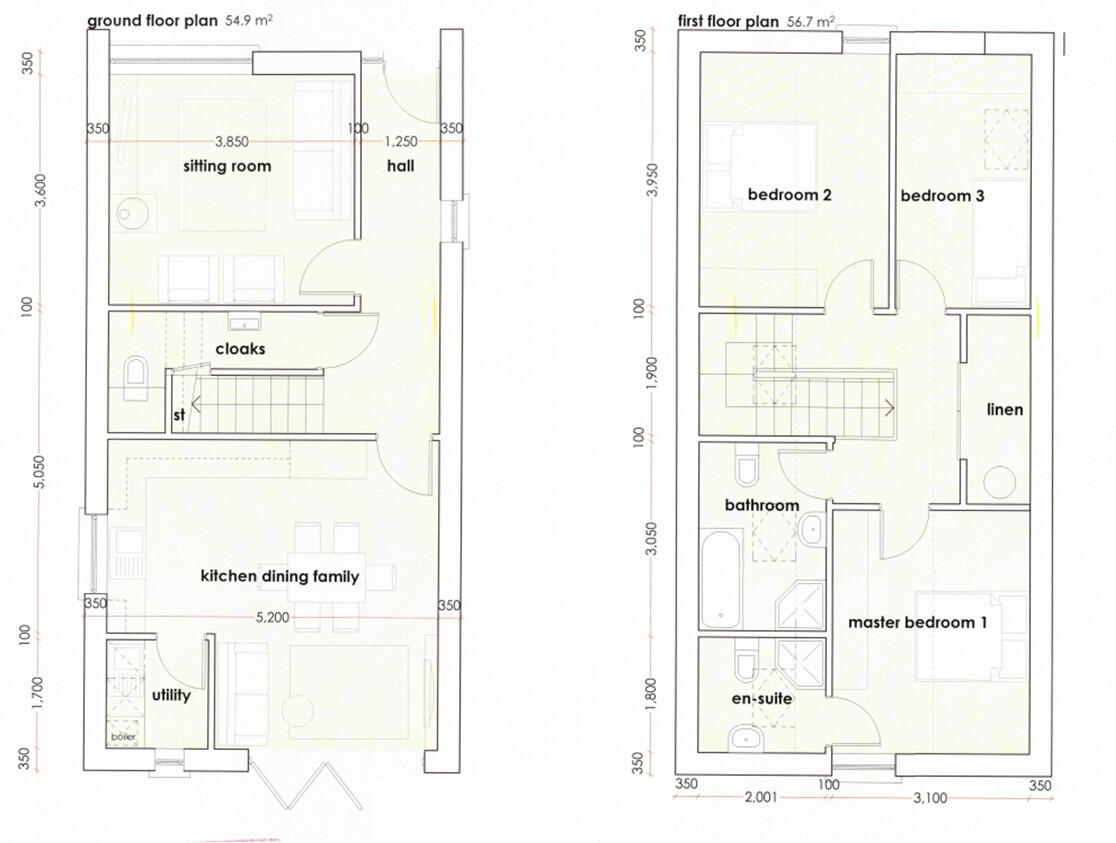 The approved dwelling includes living room, utility room, downstairs WC and open plan kitchen dining family room. The first floor comprises three bedrooms, master with ensuite and family bathroom.