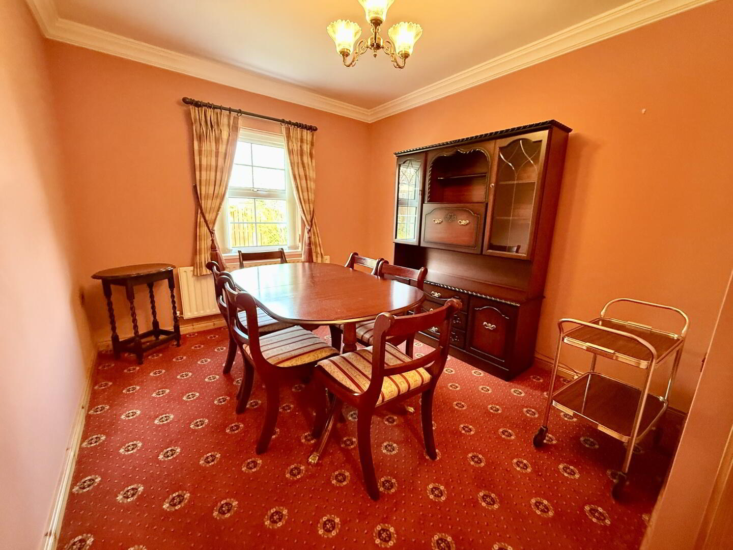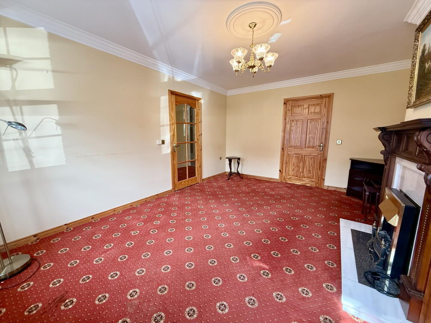 Spacious dining or secondary reception room with carpet flooring, TV and electrical points, and a rear aspect outlook. Double doors provide access to the main hallway.