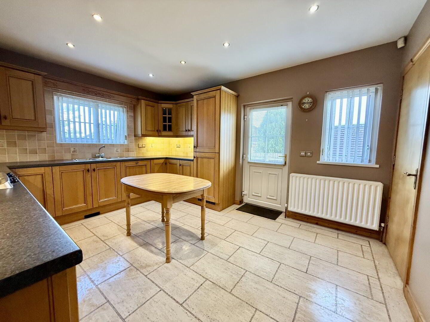 Fully fitted kitchen with an excellent range of high and low level units, integrated appliances including gas hob with overhead extractor, oven, dishwasher, and fridge-freezer. Finished with tile-effect flooring, under-unit lighting, and ceiling spotlights. The kitchen offers direct access to the rear garden and internal access to the garage.