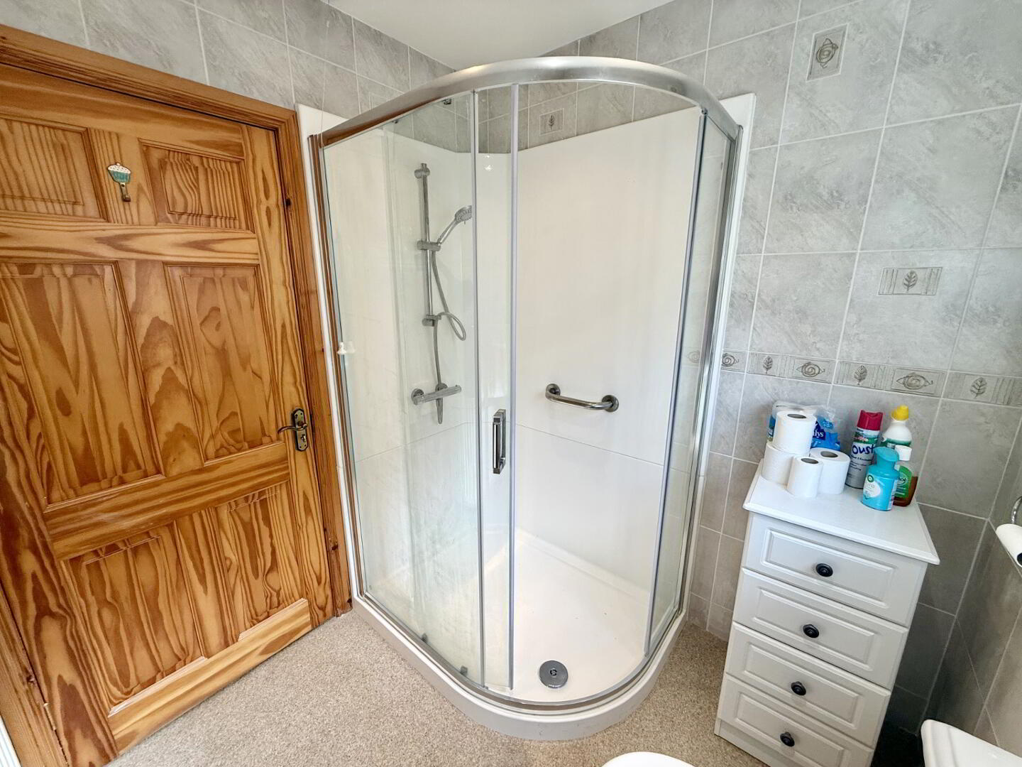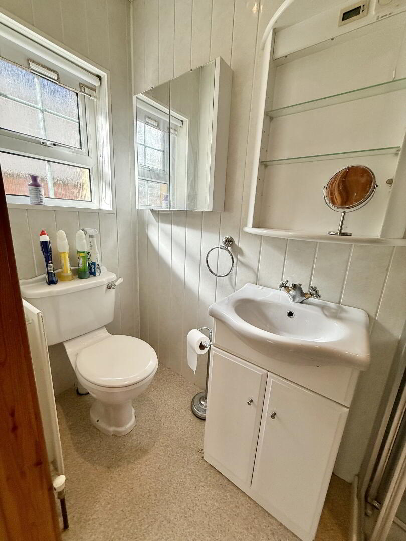 Spacious en suite fitted with a three-piece suite comprising walk-in power shower, wash hand basin, and WC. Finished with PVC wall panelling and vinyl flooring for ease of maintenance.