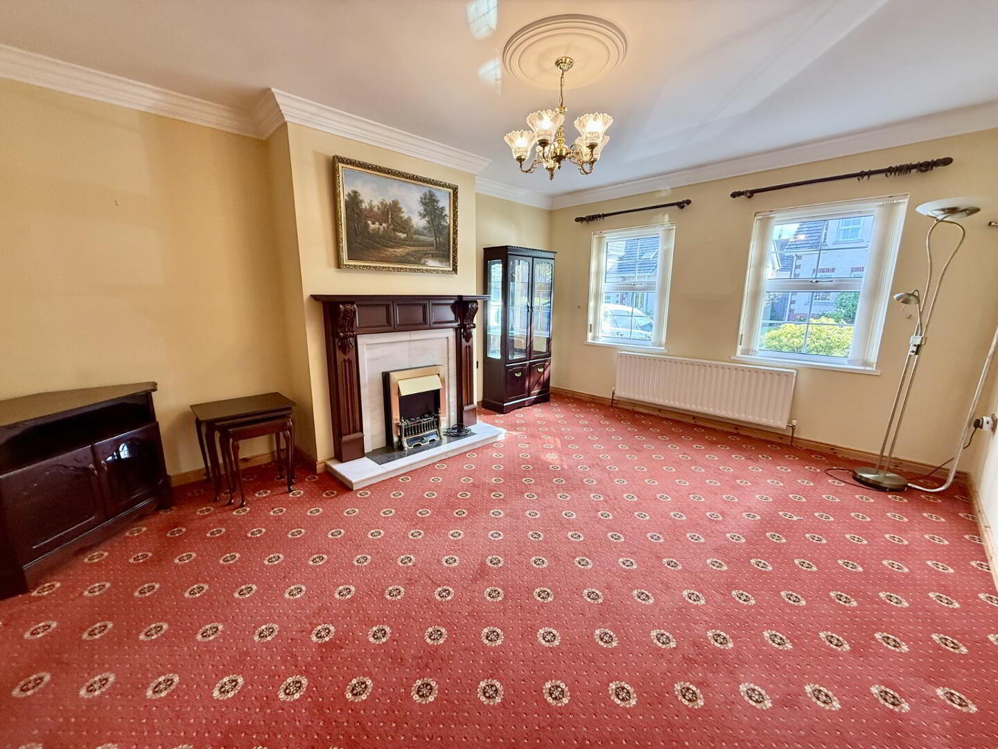 Spacious family sitting room laid in carpet, featuring a front aspect window, inset electric fireplace with decorative surround, ceiling coving with decorative ceiling roses, and multiple TV and electrical points.