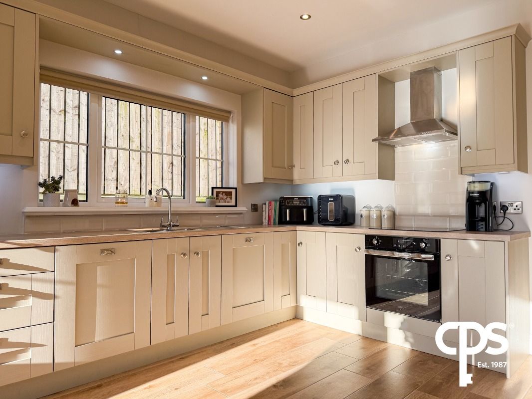 Modern, spacious, and well-equipped, with tiled flooring, a range of high and low fitted units, integrated oven and induction hob with extractor fan, stainless steel sink, and integrated fridge/freezer. The kitchen also includes pantry-style storage and double radiators. Double patio doors open to the rear garden, and a single side door provides access to the utility room.