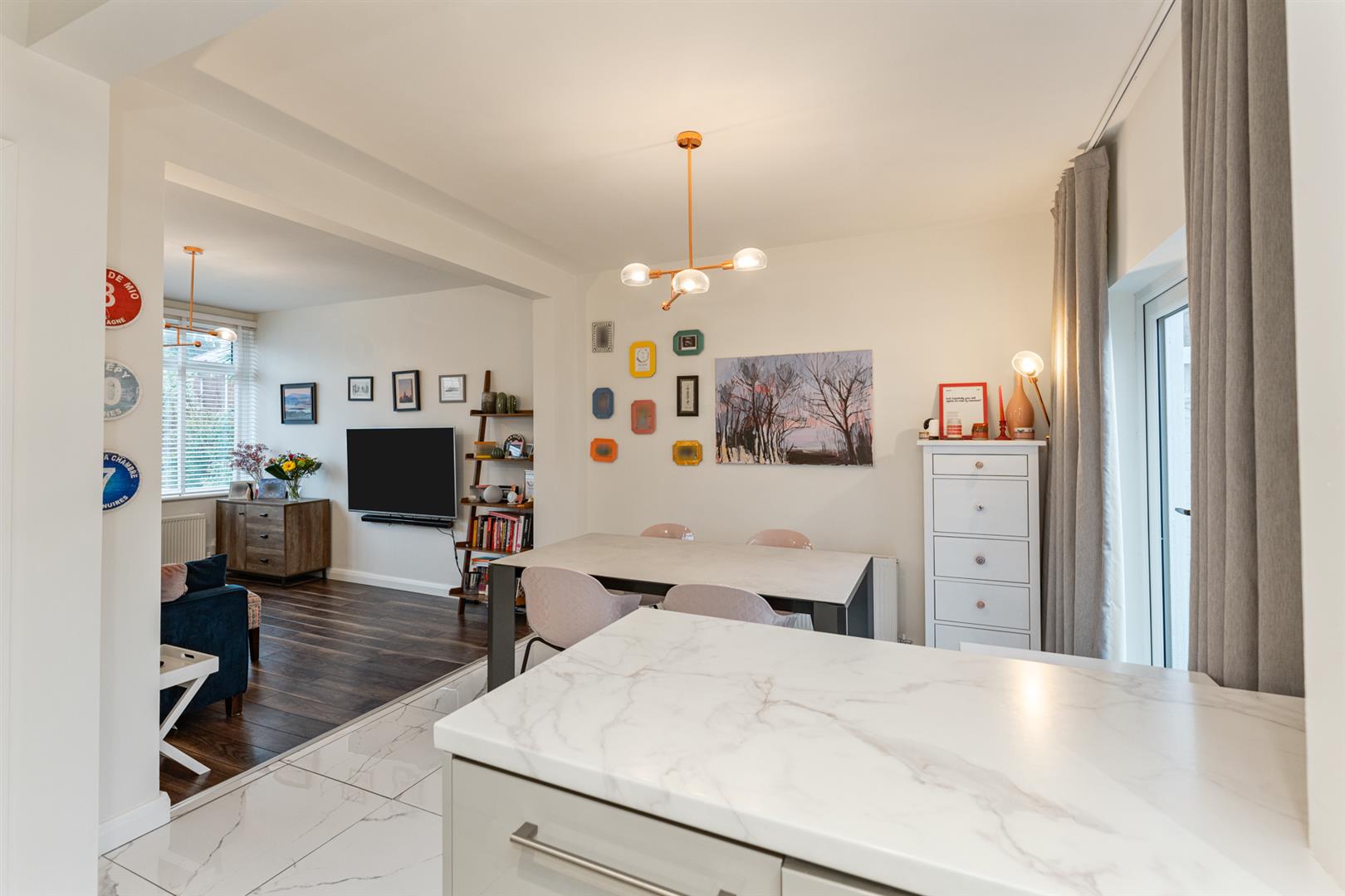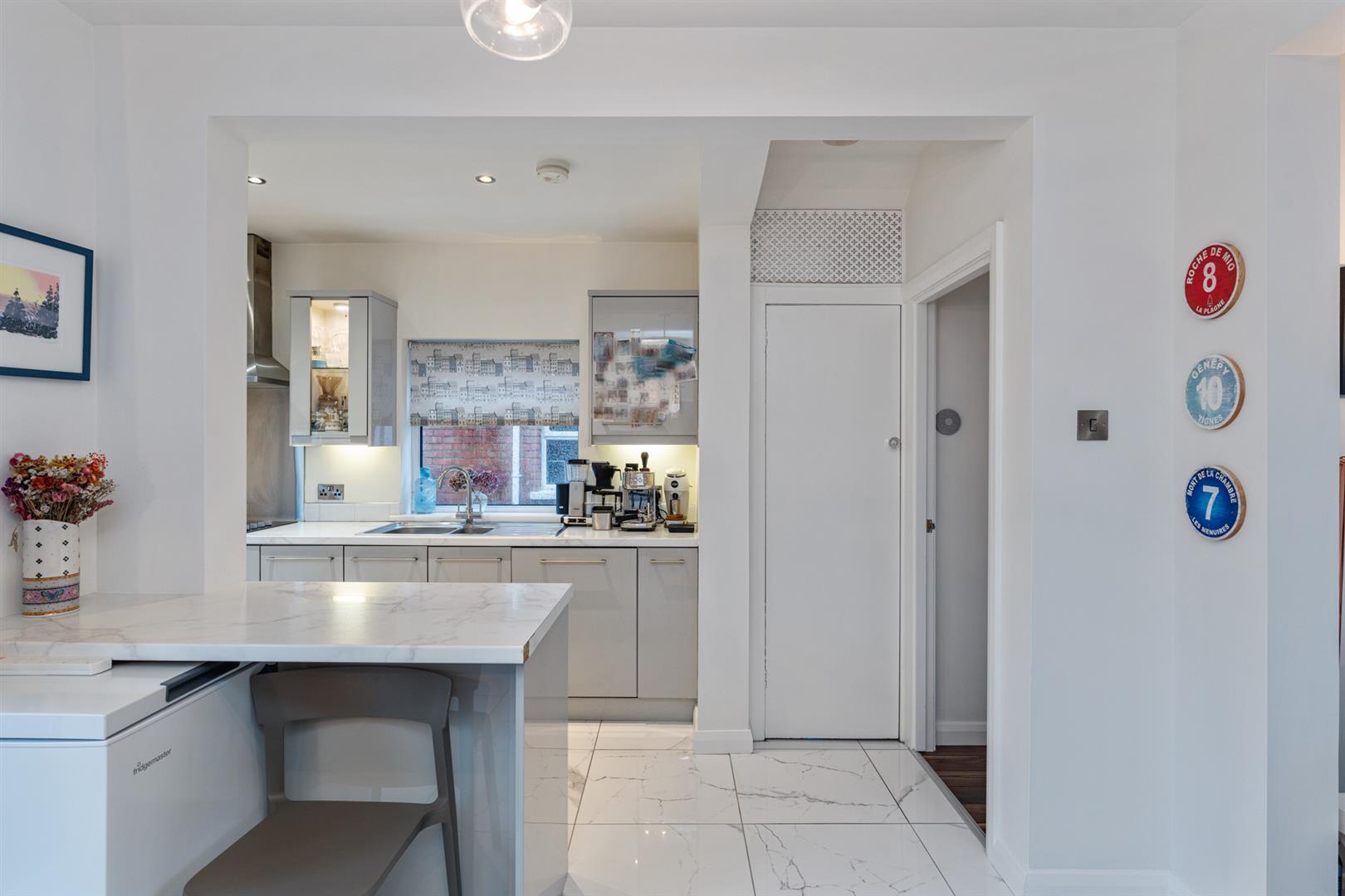 Walnut effect laminate flooring, Open plan to fitted kitchen.