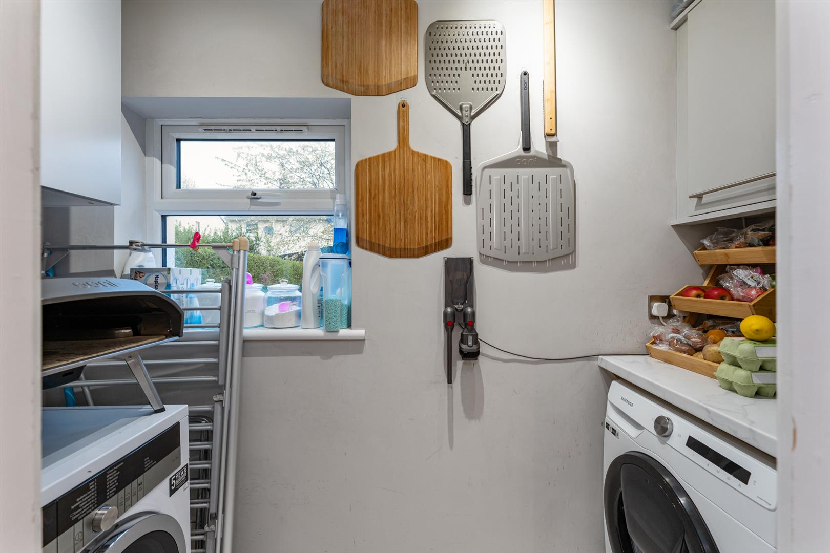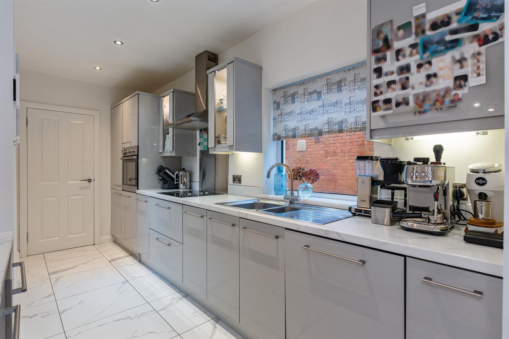 Excellent range of high and low level built in units, marble effect work tops, illuminated glazed display cabinets, concealed lighting. Built in 4 ring ceramic hob & stainless steel overhead extractor fan, stainless steel splash back, integrated fridge freezer and dish washer, tiled splash back, breakfast bar, spotlights.