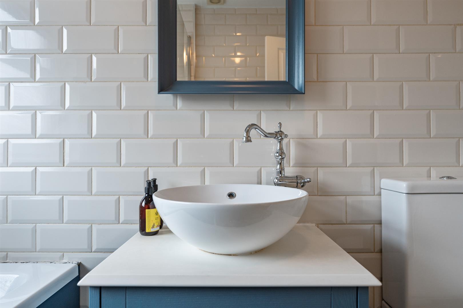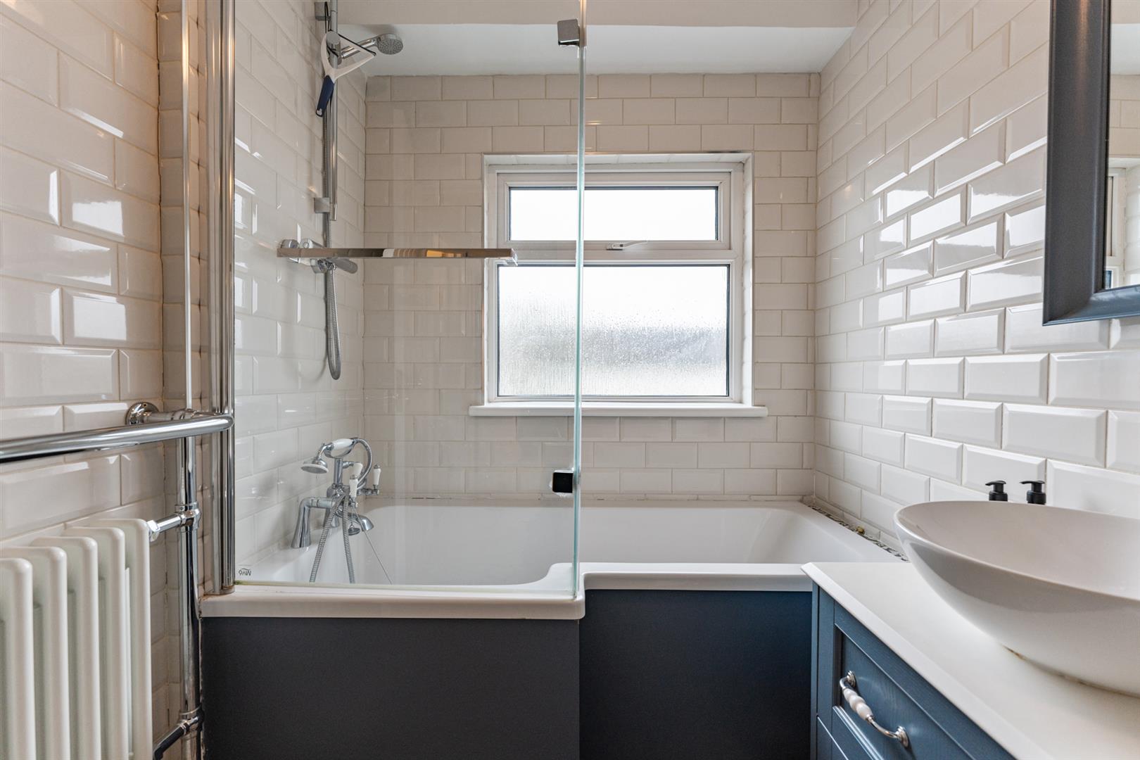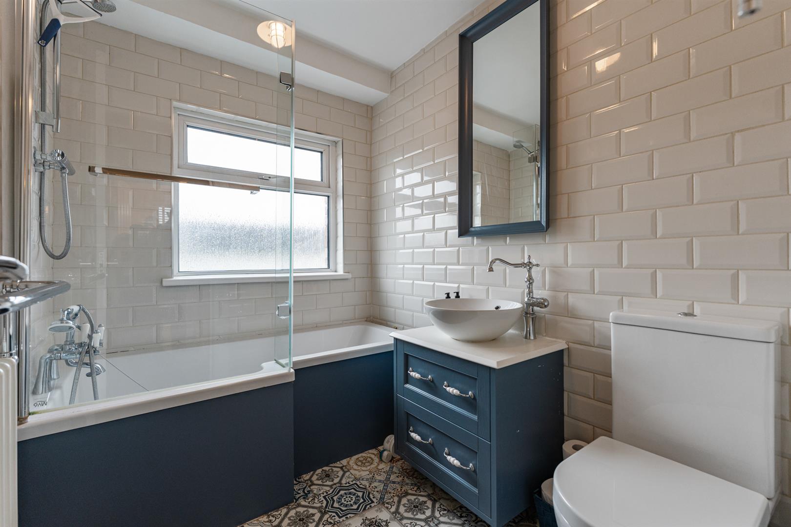 Comprising Rosberry colour ,P-Shaped bath, with panel in peacock blue finish, mixer taps and telephone hand shower, additional shower unit above, shower screen, matching sink unit with mixer taps and storage below in a peacock blue finish,, low flush W/C. Fully tiled walls, decorative tiled floor. Victorian style radiator with heated towel rail attached.