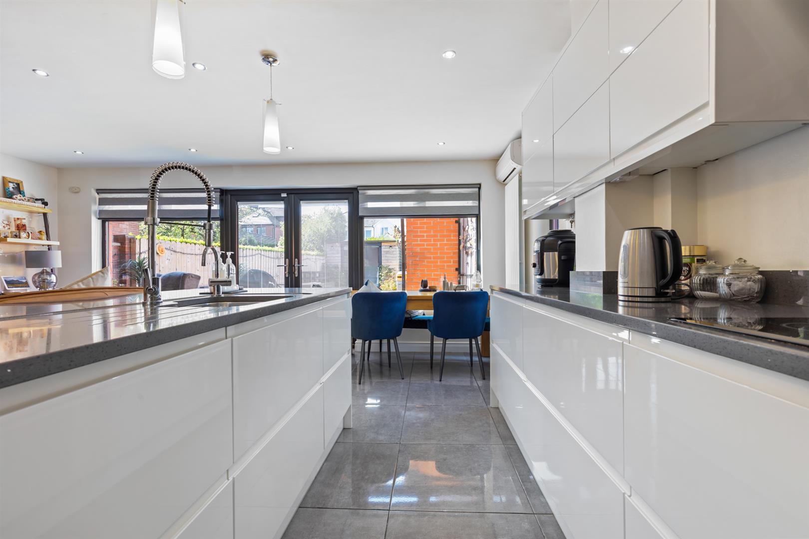 (at widest points) Full range of high and low level handleless units, granite worktops, overhead 'Airford' extractor fan, oven and warming drawer, plumbed for American fridge freezer.