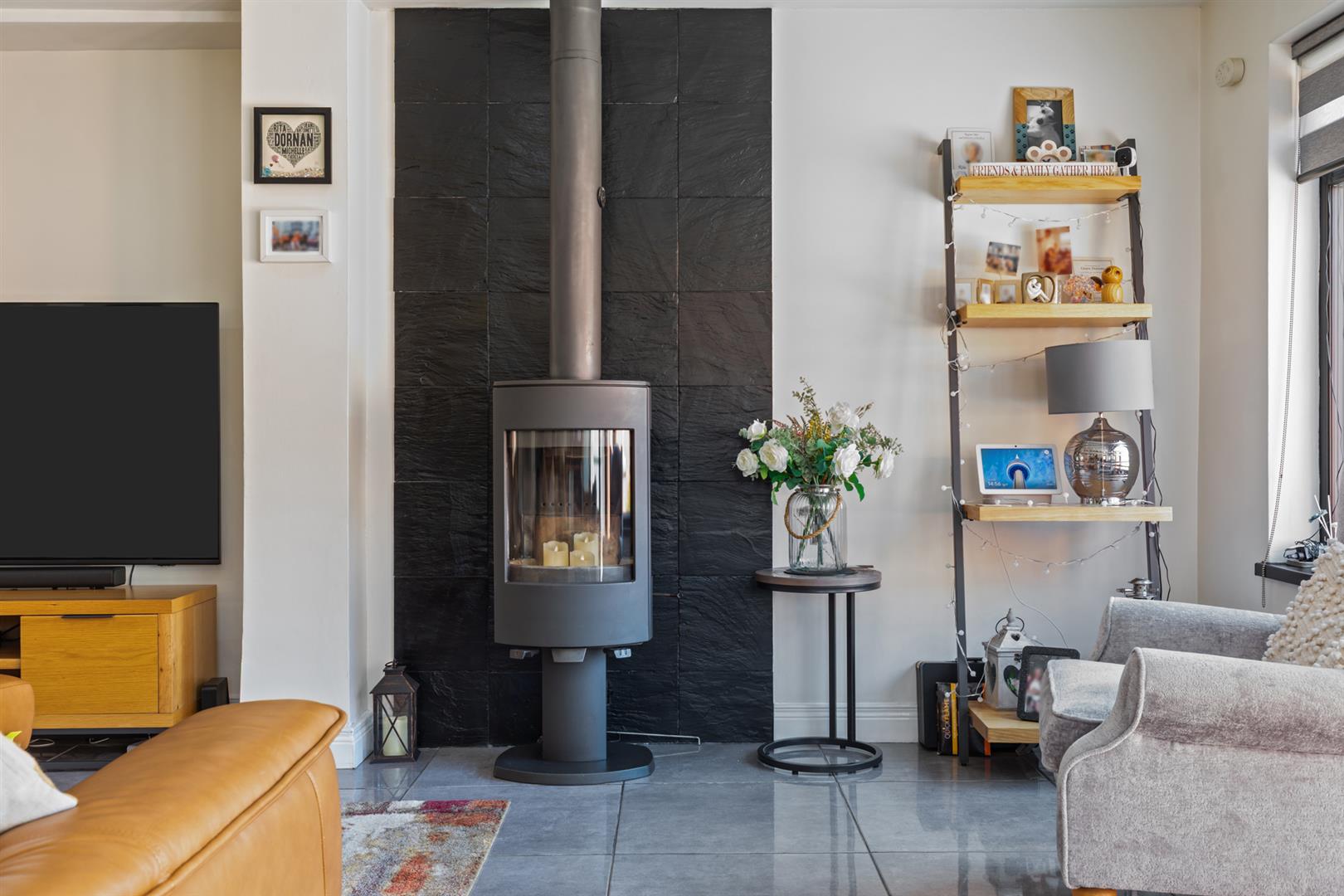 Cast iron wood burning stove to living area. Spot-lights. Pvc patio doors with glazed side panels providing access to rear garden/patio.