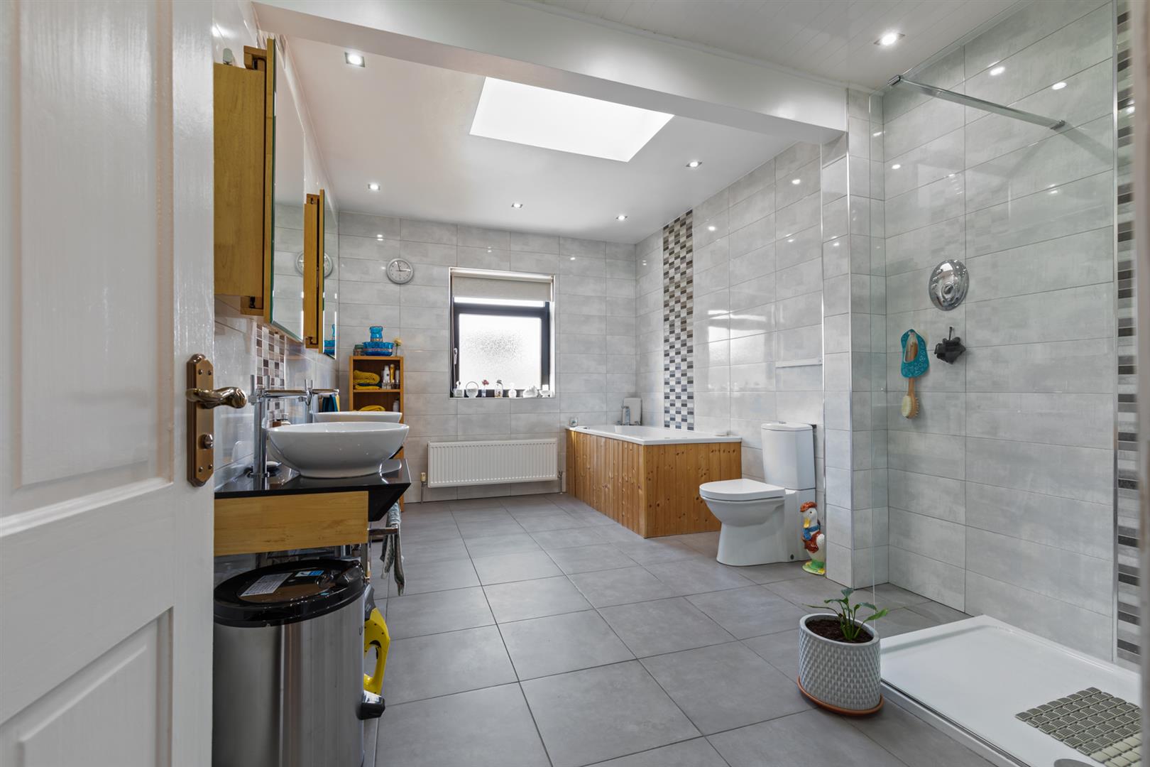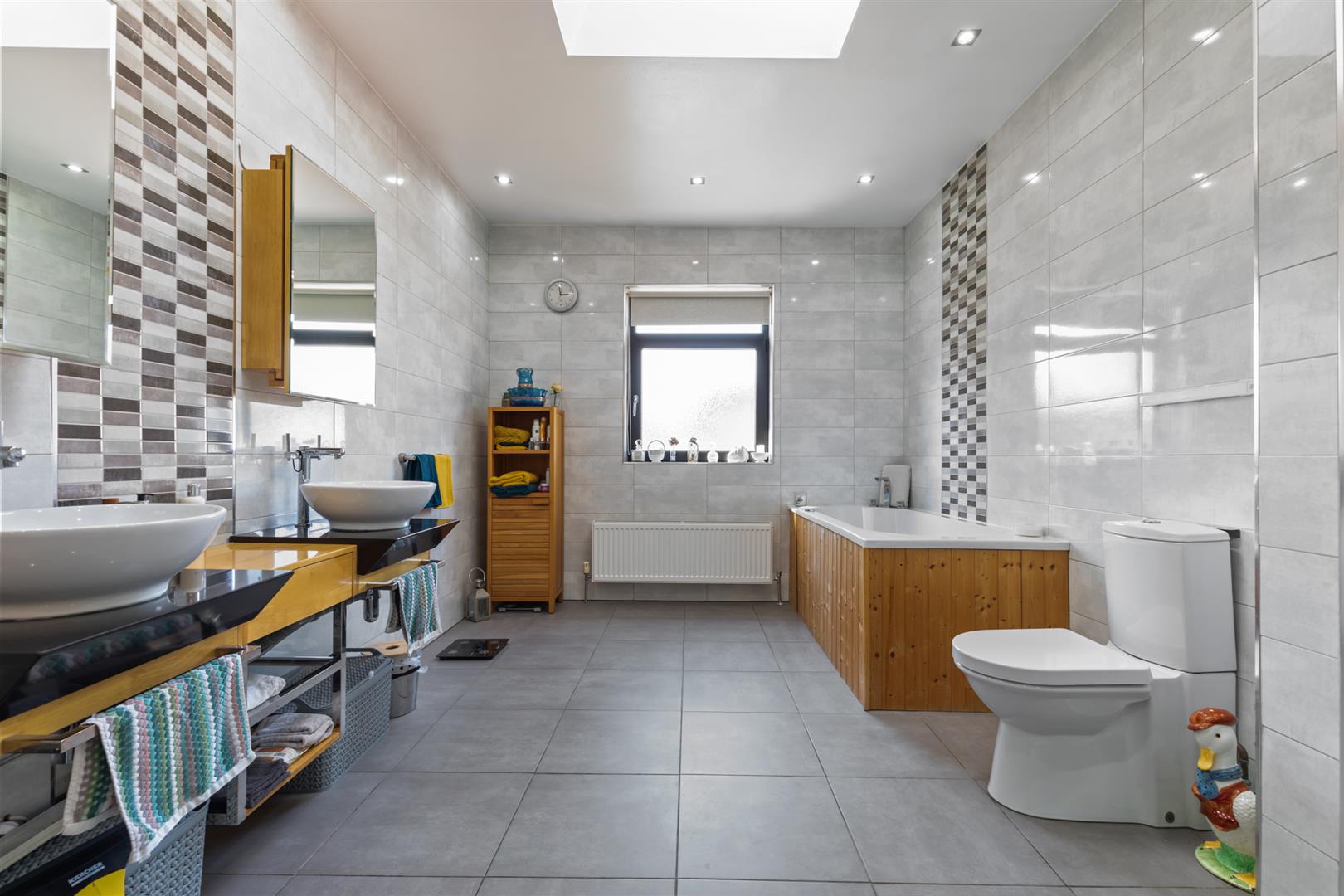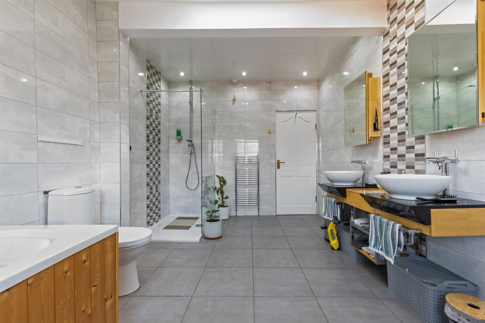 Comprising white panelled Jacuzzi bath with mixer taps, large walk in shower cubicle, twin sink units, with wall mounted illuminated vanity unit with storage below, low flush w.c Spotlights. Heated chrome towel rail. Fully tiled walls. Tiled flooring.