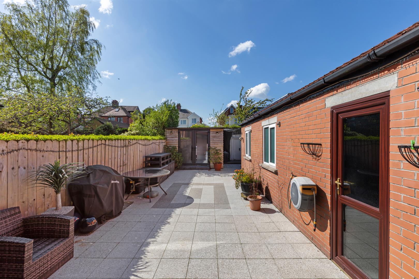 Large enclosed westerly facing flagged patio area. Bordered by timber fencing that captures the afternoon sun. Wooden garden room, pvc glass glass panelled doors.