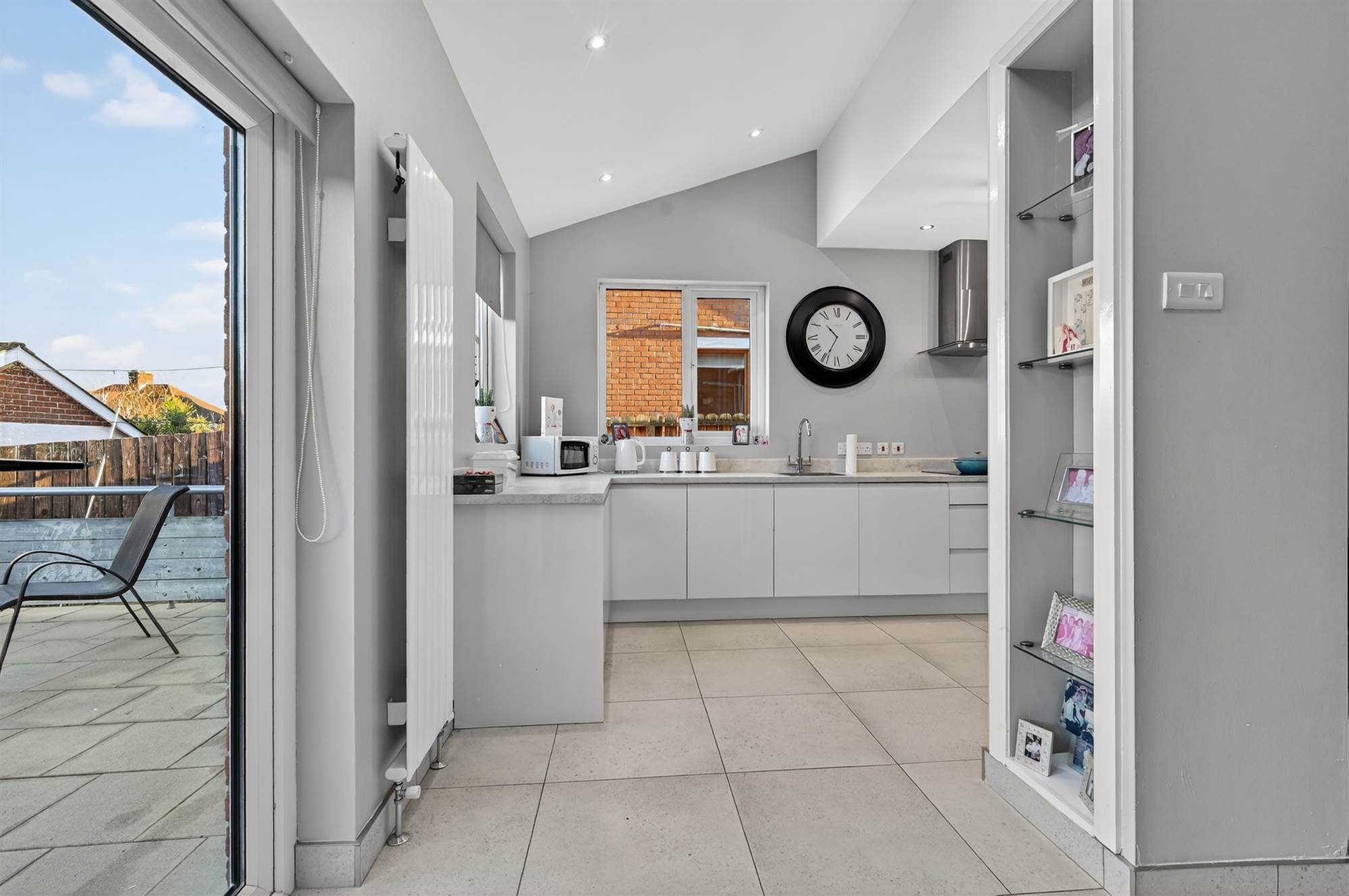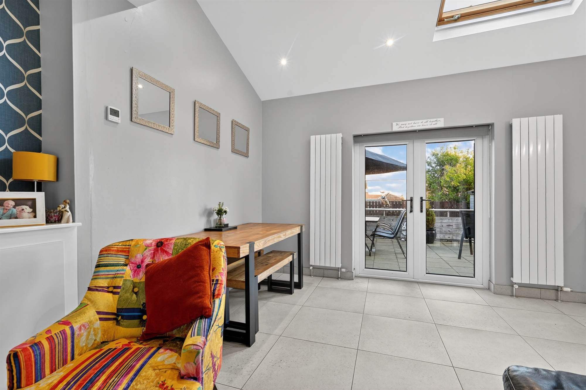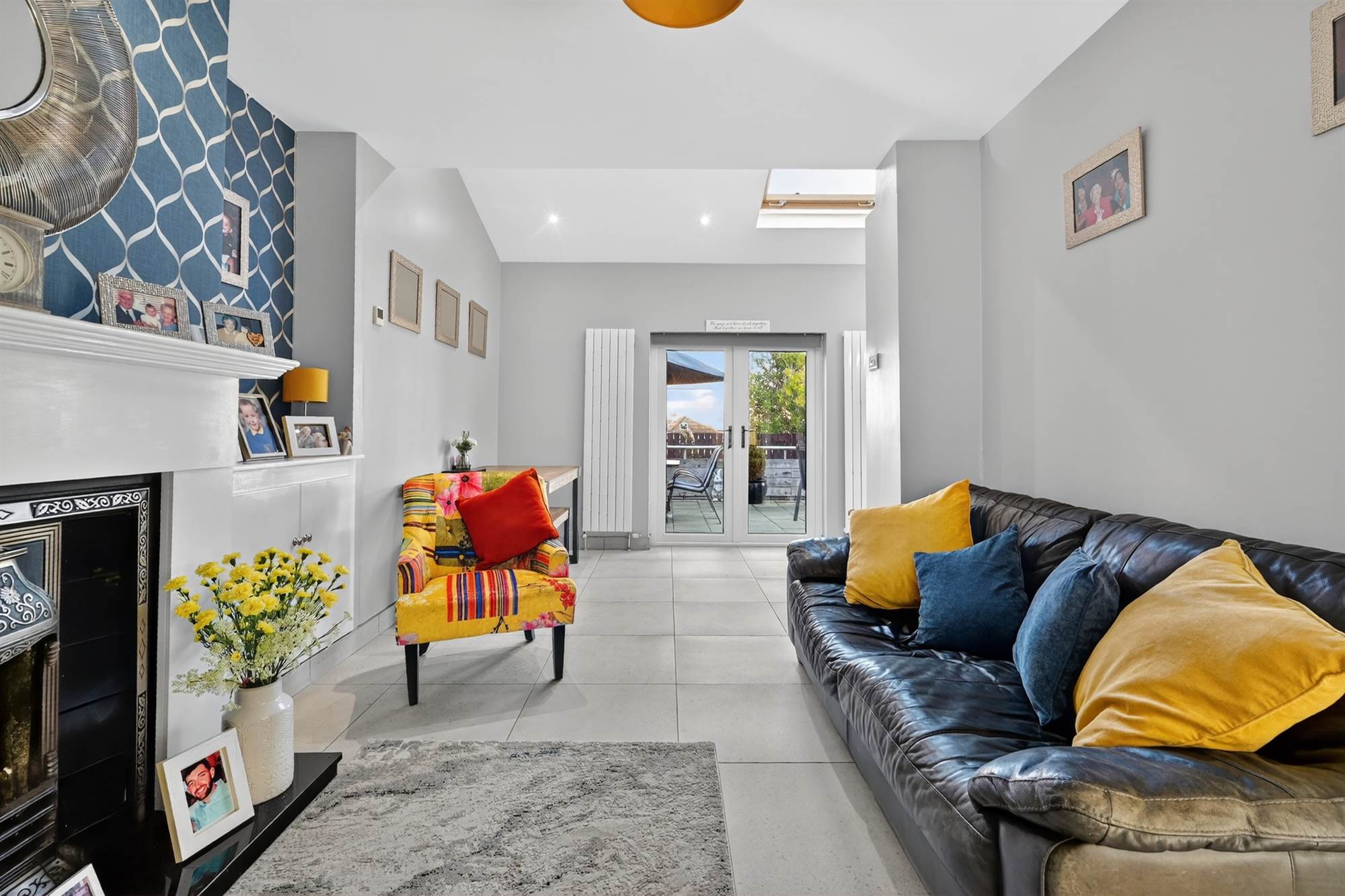 (at widest points). Excellent modern fully fitted kitchen with excellent range of high and low level units, laminate work surfaces, integrated four ring induction hob with extractor fan above, stainless steel sink with mixer tap, integrated dishwasher, built-in high level double oven, integrated washing machine, porcelain tiled floor, low voltage spotlights. Dual aspect windows with outlook to rear garden. PVC double glazed French doors to garden. Open to living/dining area with timber surround fireplace, cast iron and tiled inset, granite hearth, Velux window.