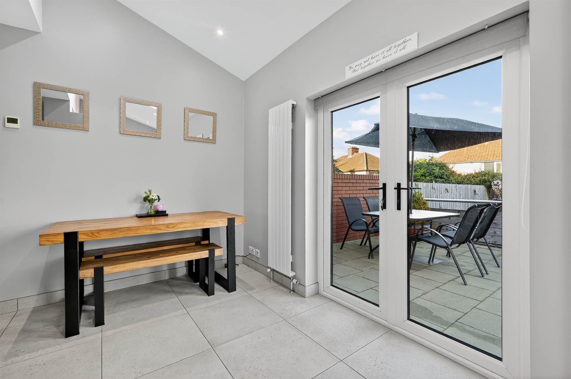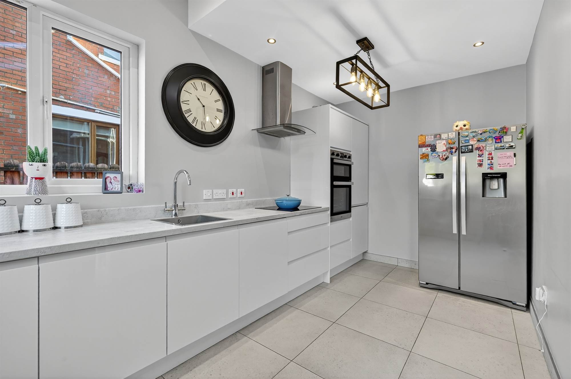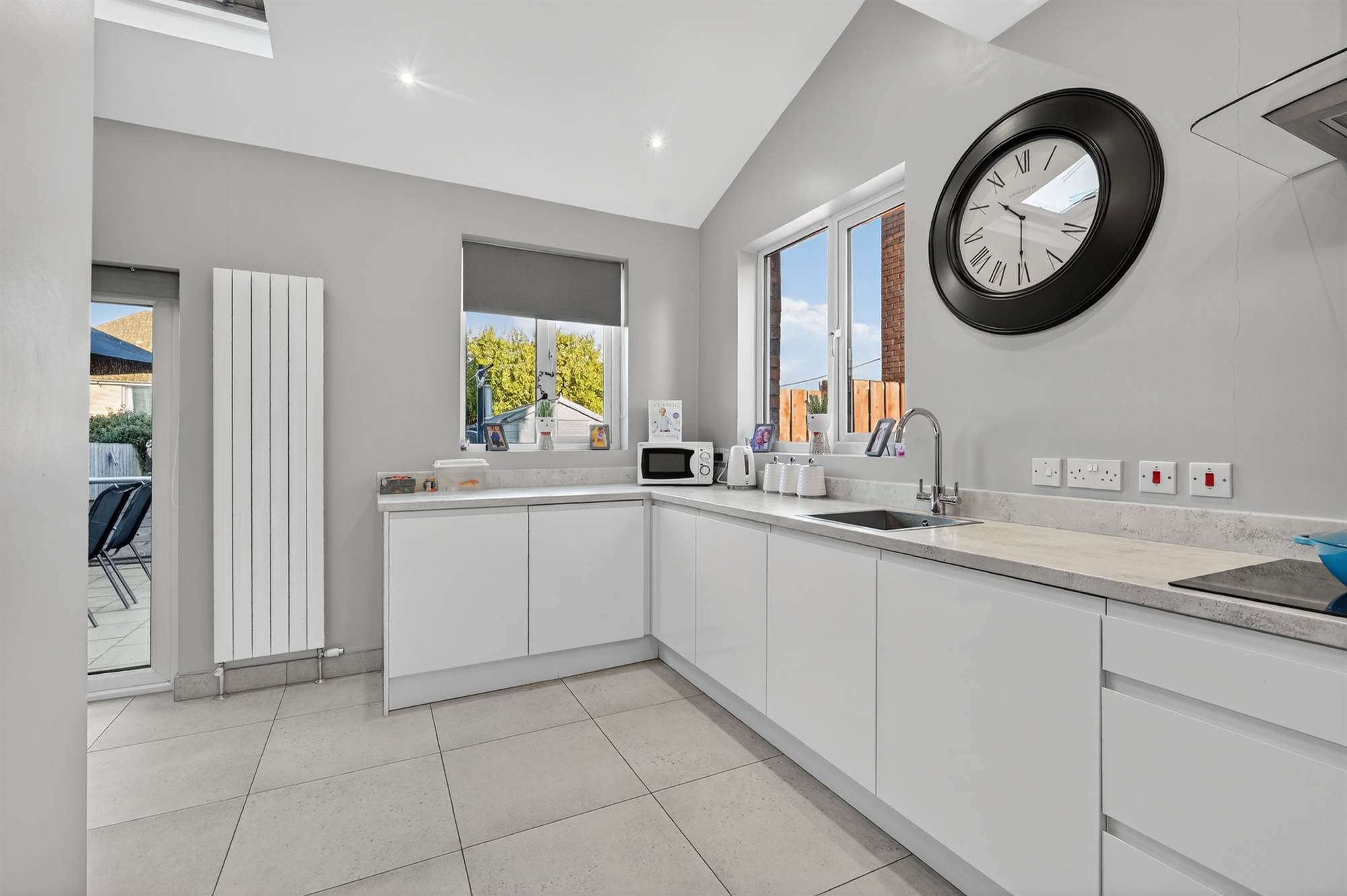 (at widest points). Excellent modern fully fitted kitchen with excellent range of high and low level units, laminate work surfaces, integrated four ring induction hob with extractor fan above, stainless steel sink with mixer tap, integrated dishwasher, built-in high level double oven, integrated washing machine, porcelain tiled floor, low voltage spotlights. Dual aspect windows with outlook to rear garden. PVC double glazed French doors to garden. Open to living/dining area with timber surround fireplace, cast iron and tiled inset, granite hearth, Velux window.