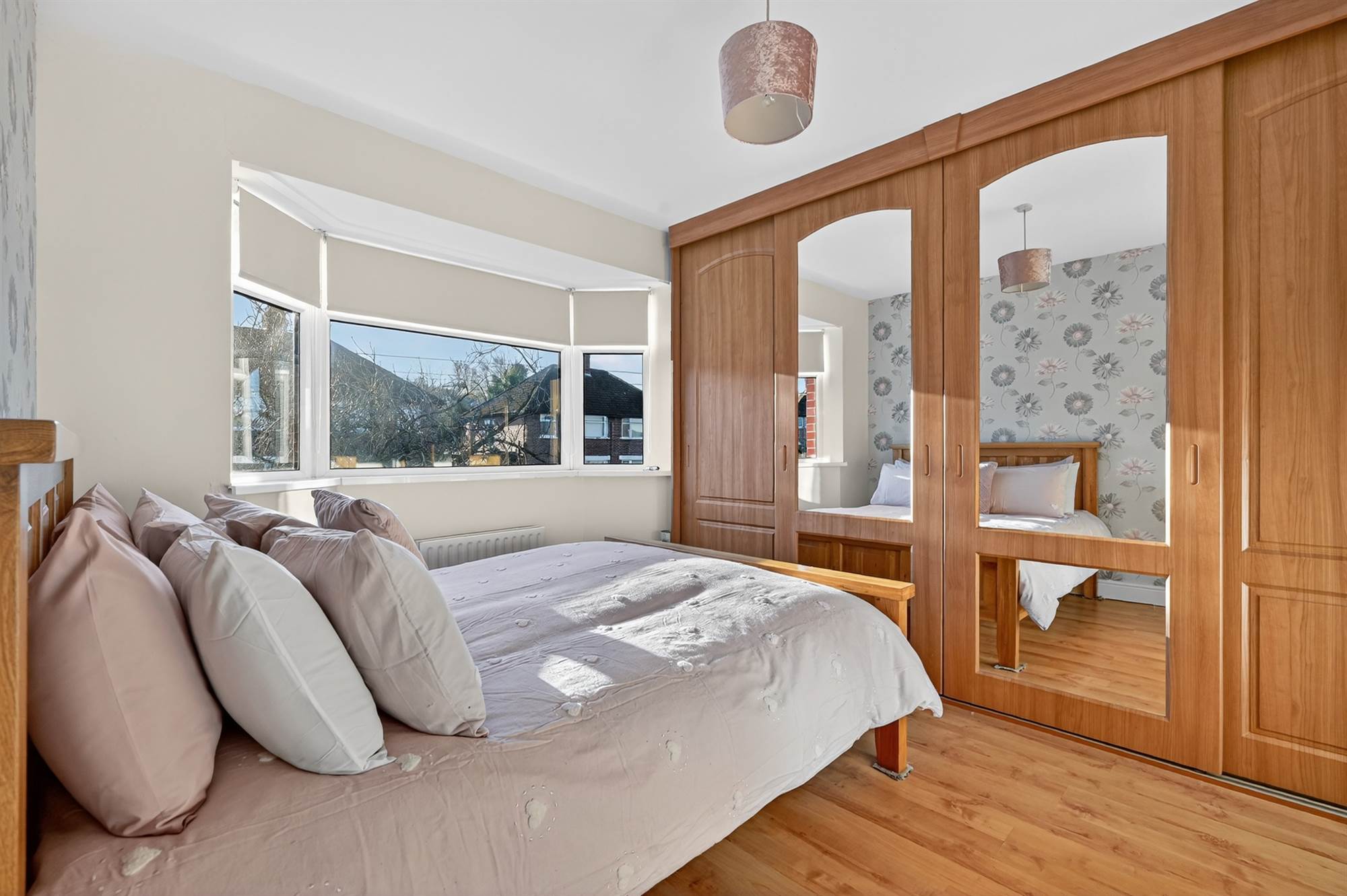 (Measurements into bay). Laminate wooden floor. Extensive range of wall-to-wall built-in robes with mirror fronted sliding doors.