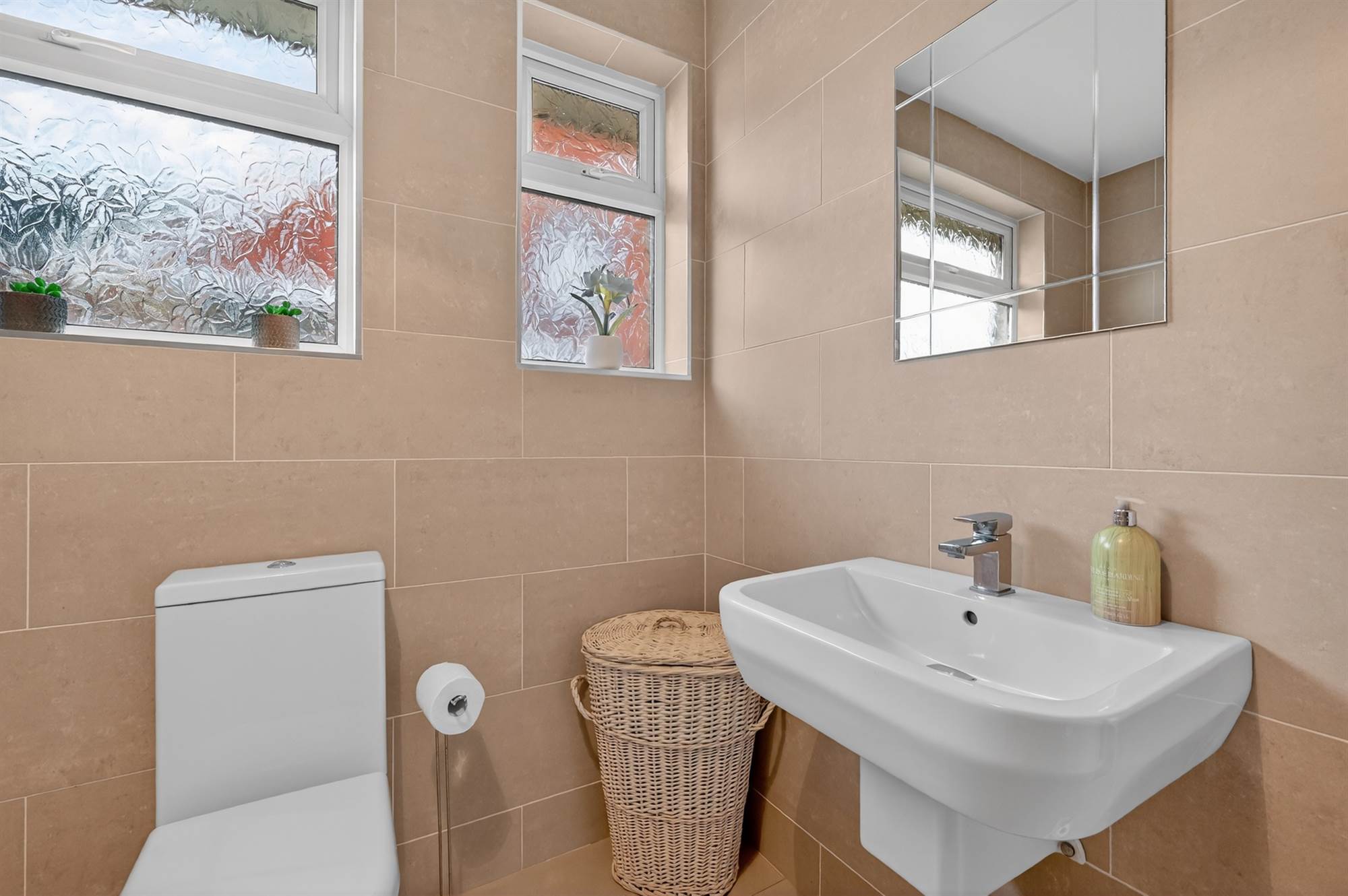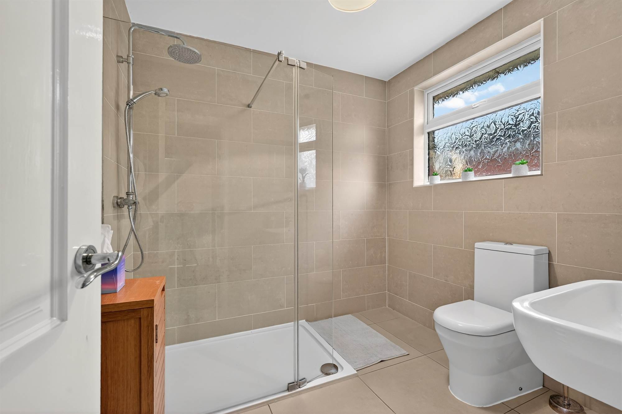 White suite comprising low flush wc, floating wash hand basin with chrome mixer taps, walk-in shower with chrome overhead shower unit, additional shower attachment, porcelain tiled floor, fully tiled walls, chrome heated towel rail. Access to fully floored roofspace via Slingsby type ladder, built-in gas fired boiler, Velux window.