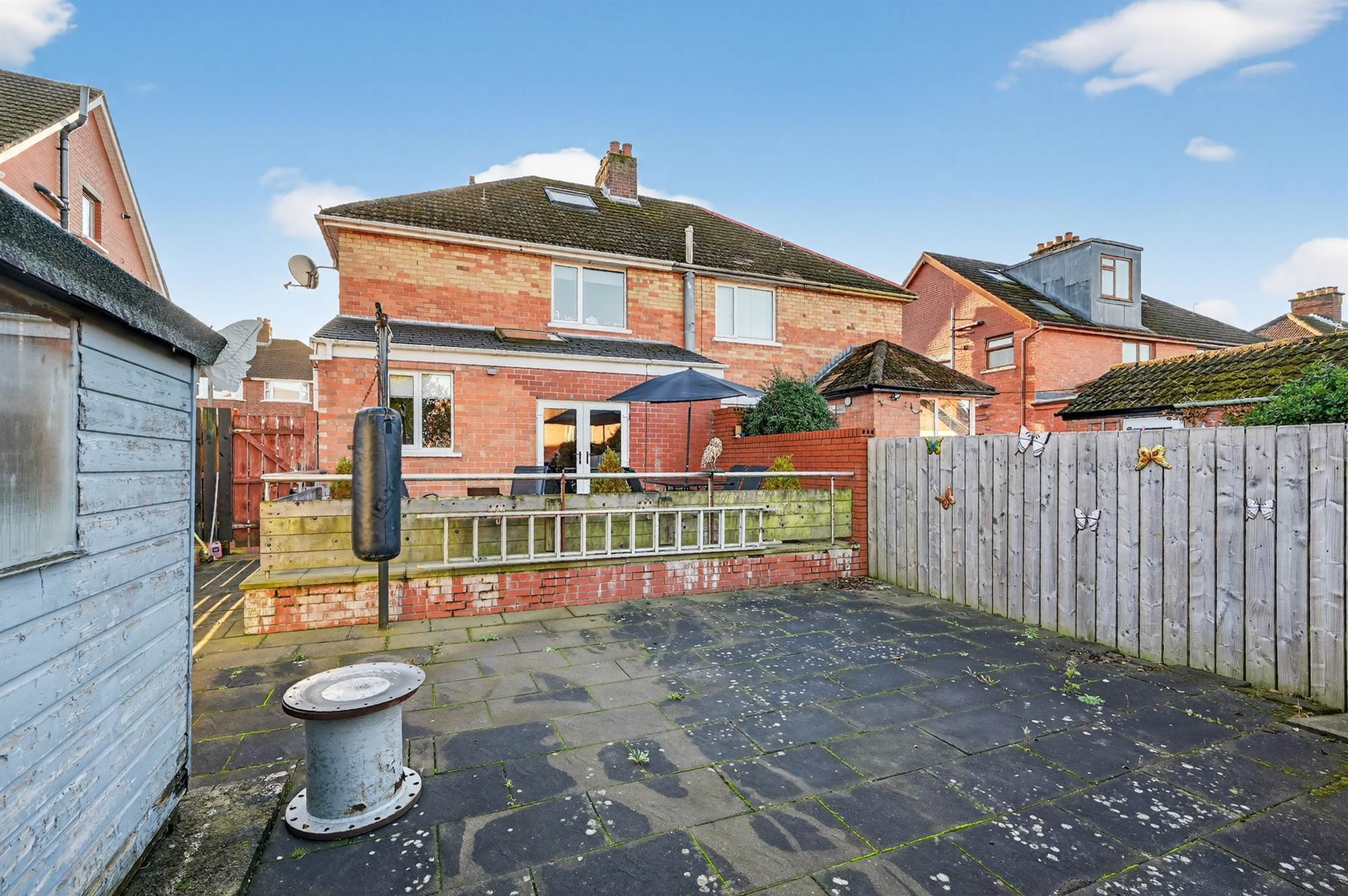 Large rear garden with an elevated paved patio area