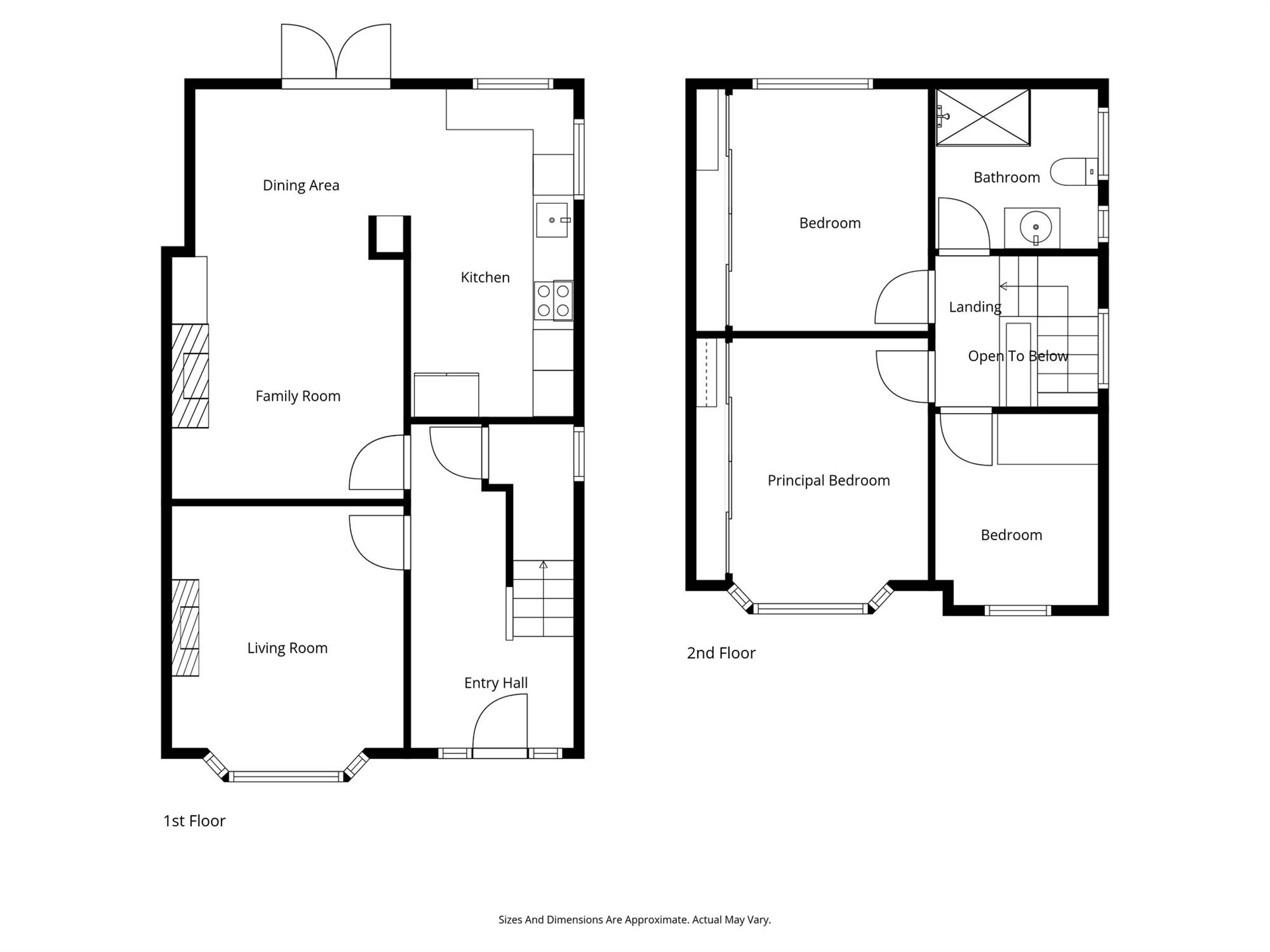 A spacious living room featuring a bay window and an elegant fireplace