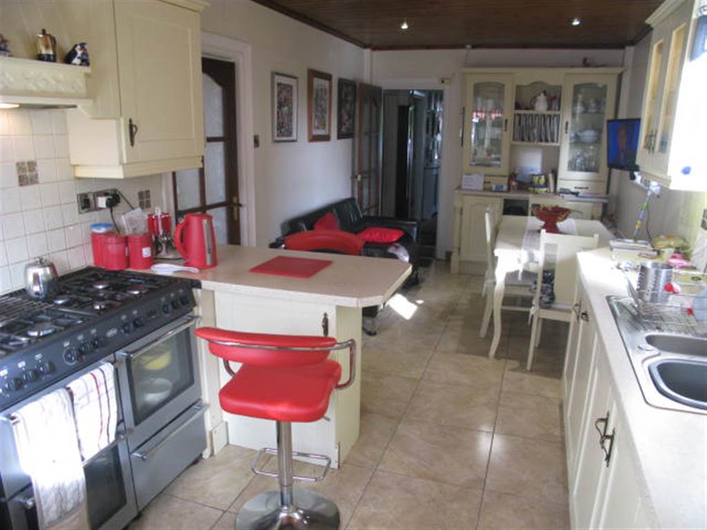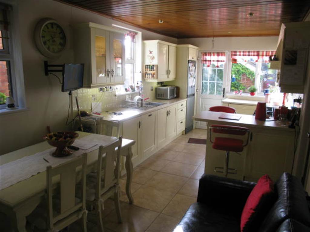 Range of high and low level units with complementary work surfaces and breakfast bar. Integrated dishwasher, plumbed for washing machine, space for range cooker, part tiled walls, ceramic tiled floor. Tongue and groove panel ceiling with recessed down lights, casual dining area.