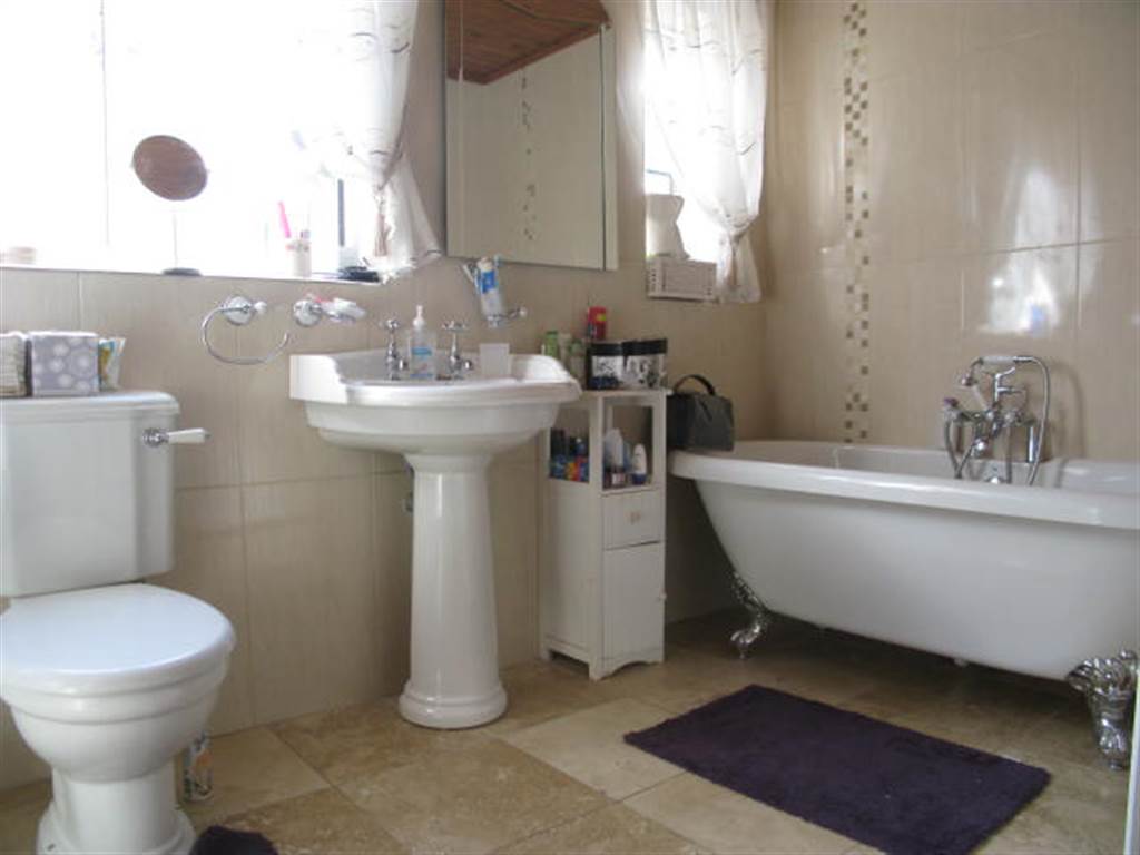 White suite comprising tiled shower cubicle with power shower, claw foot roll top bath, pedestal wash hand basin and low flush wc.Tiled walls and floor, tongue and groove panel ceiling with recessed downlights, hot press and single panel radiator.