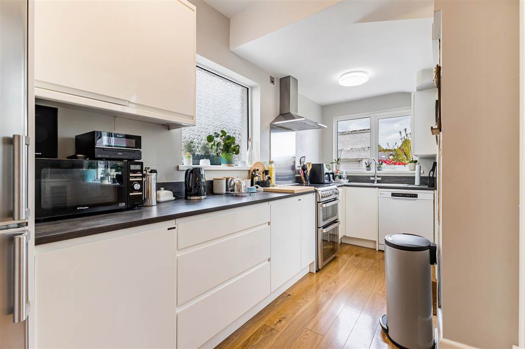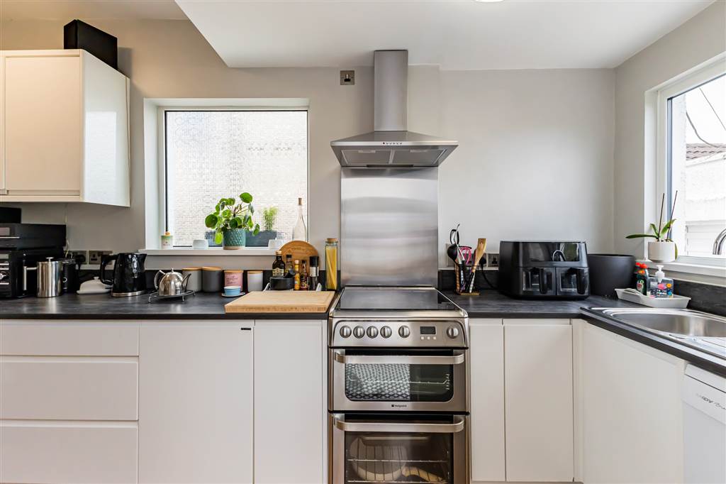 At widest.Range of high and low level units, built in oven with matching cooker hood.Built in dishwasher, fridge/ freezer and built in storage.
