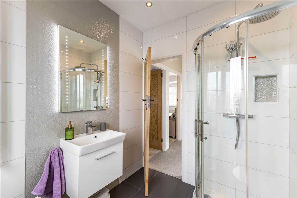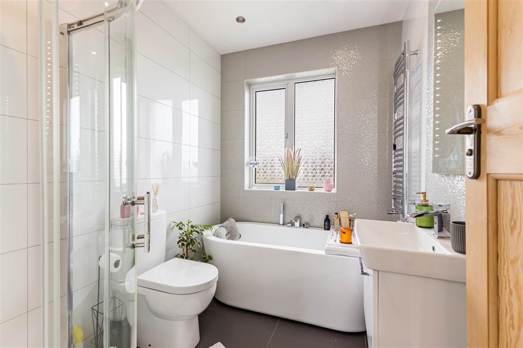 Comprising of corner shower with overhead shower and shower doors.Wash hand basin and free standing bath and low flush wc. Fully tiled and low voltage lighting.