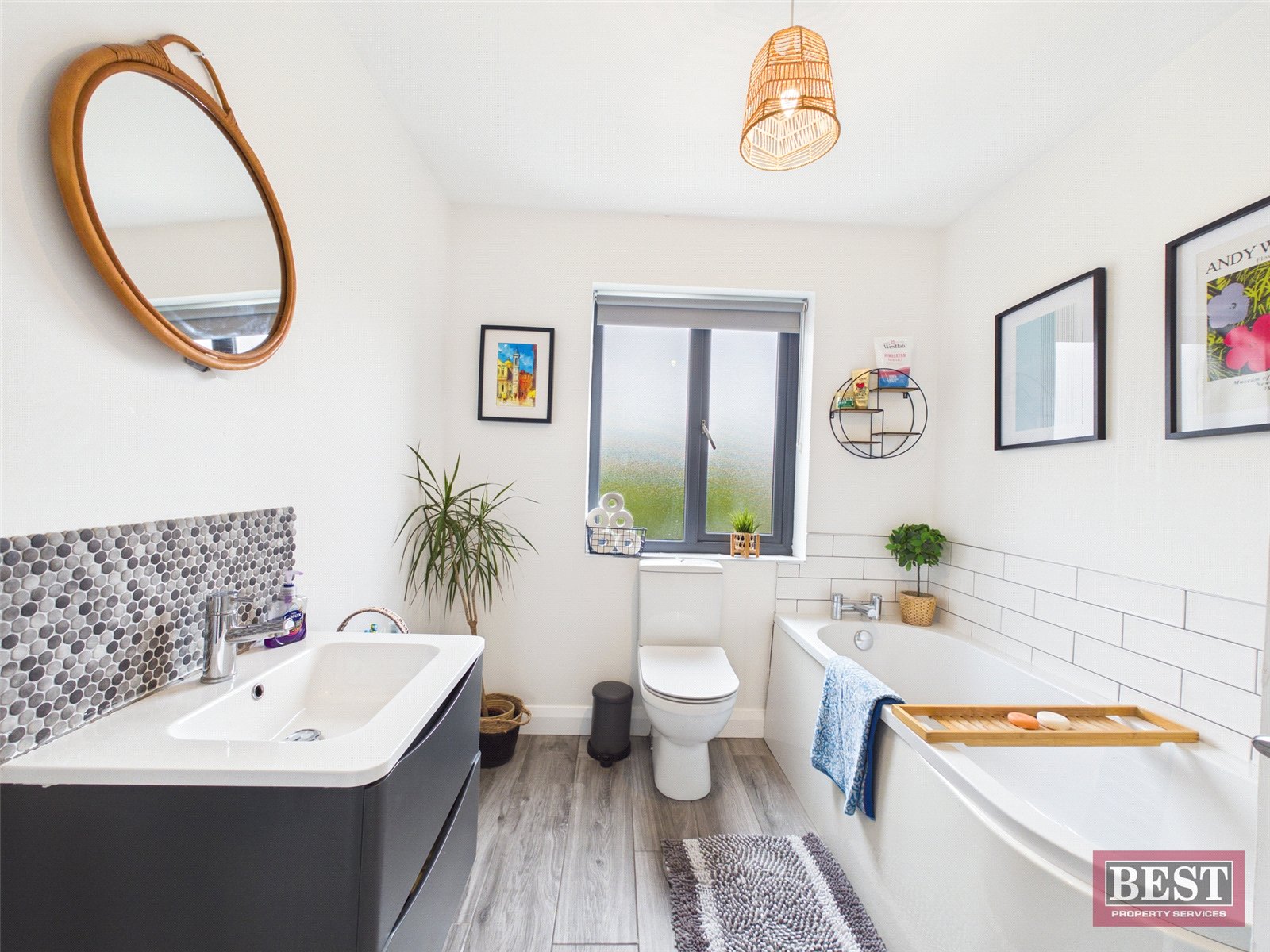 Outside, the south facing garden is paved with patio slabs and includes an astroturf lawn and garden shed. To the front there is a large driveway with room for several cars