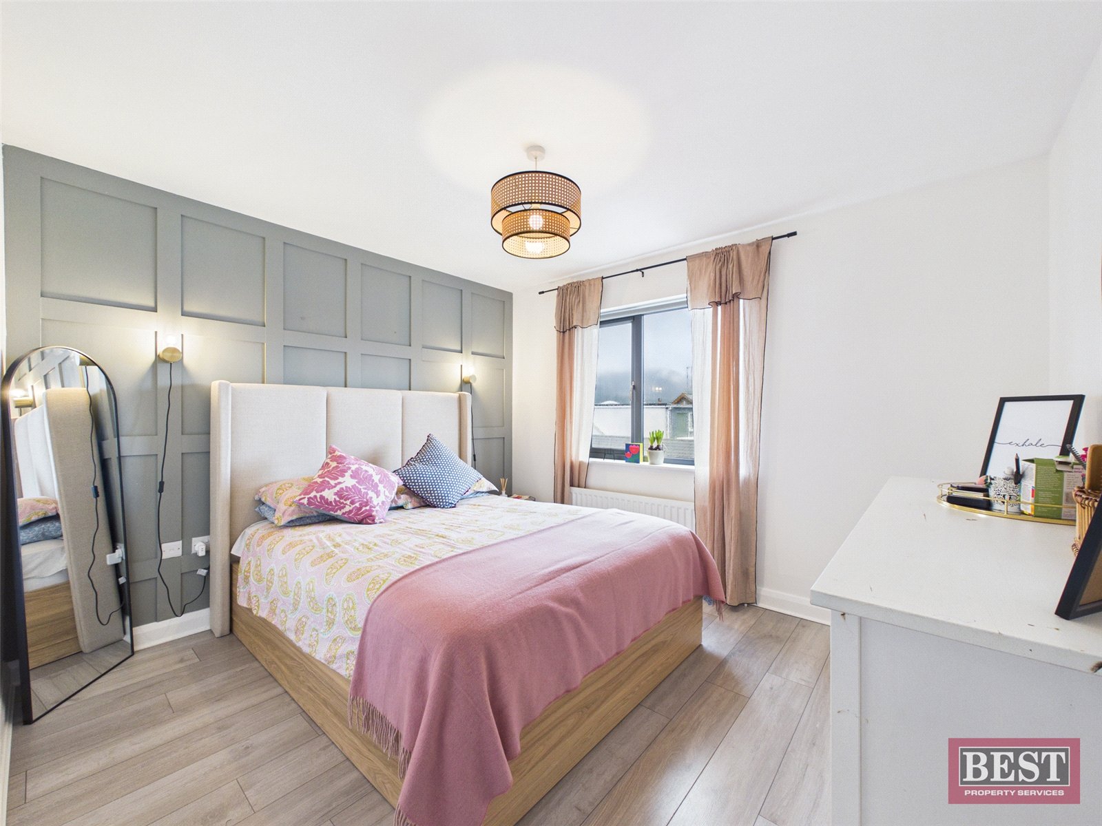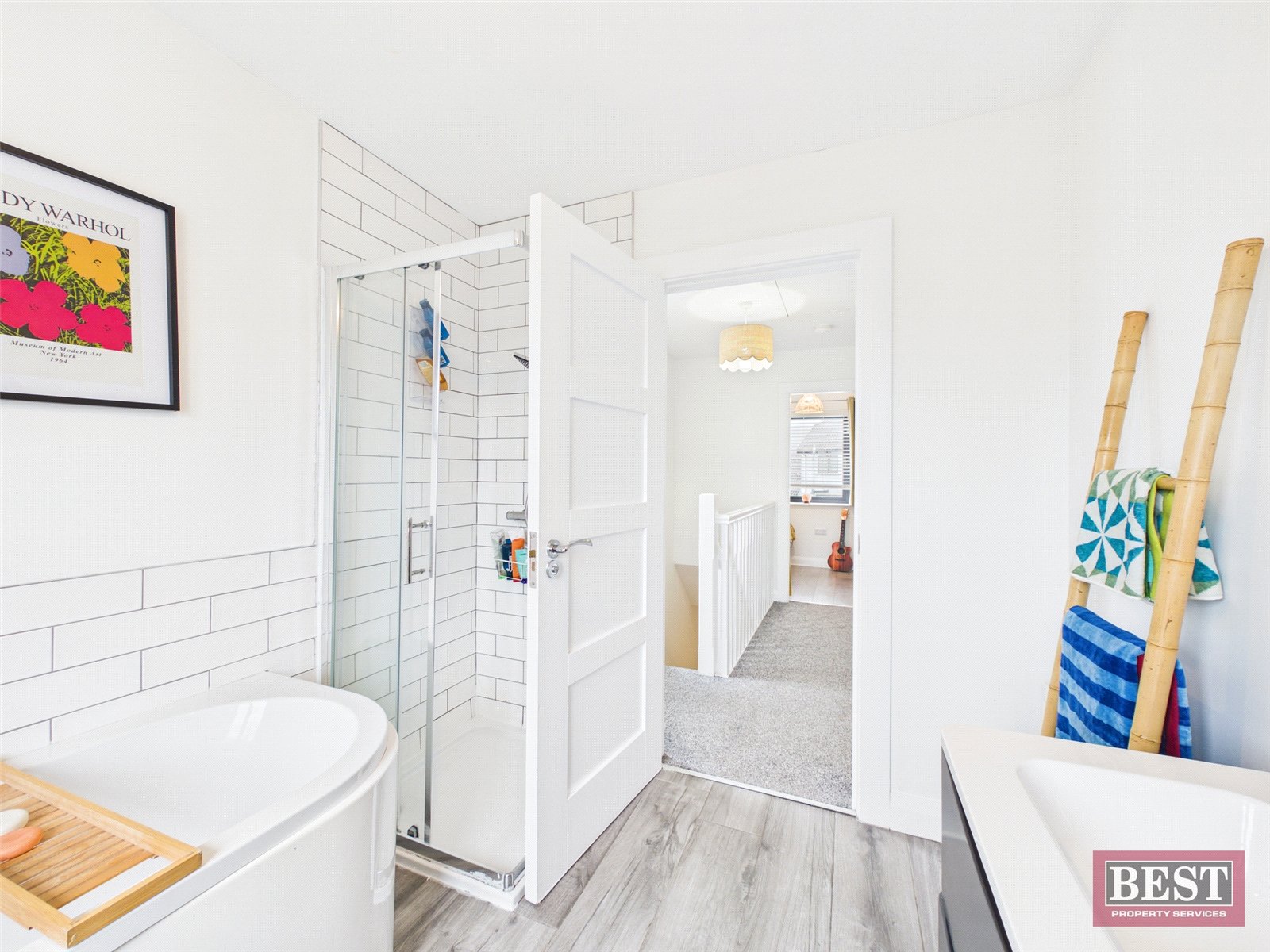 Upstairs, the master bedroom overlooks the rear garden along with views of Kilbroney Forest Park. The room benefits from a walk-in wardrobe which is conveniently plumbed should a new owner want to convert it to an ensuite bathroom. There is a second double bedroom to the front of the house with a Juliet balcony and a third single bedroom, ideal for kids or a home office. The main house bathroom includes a separate bath and shower