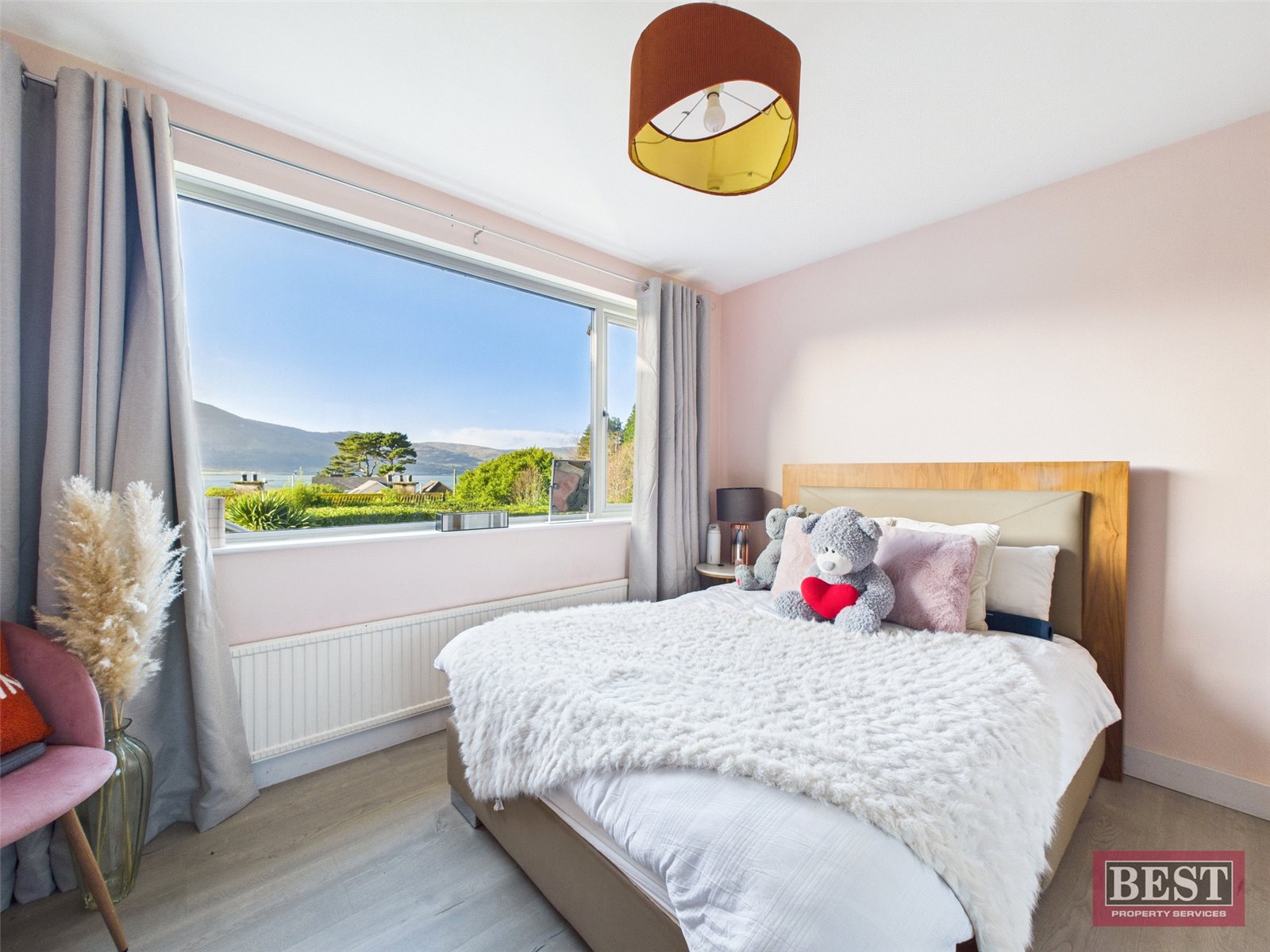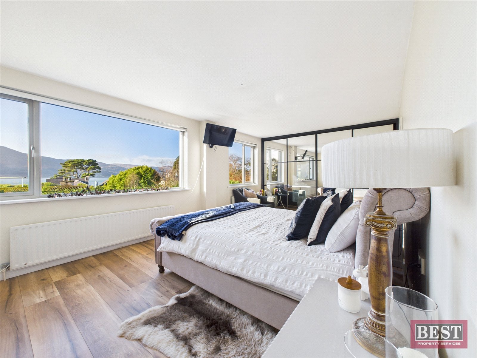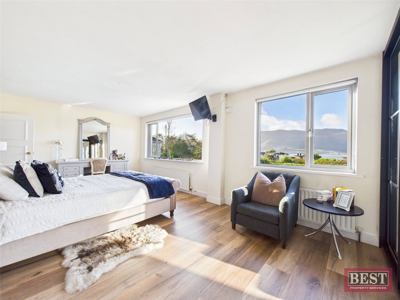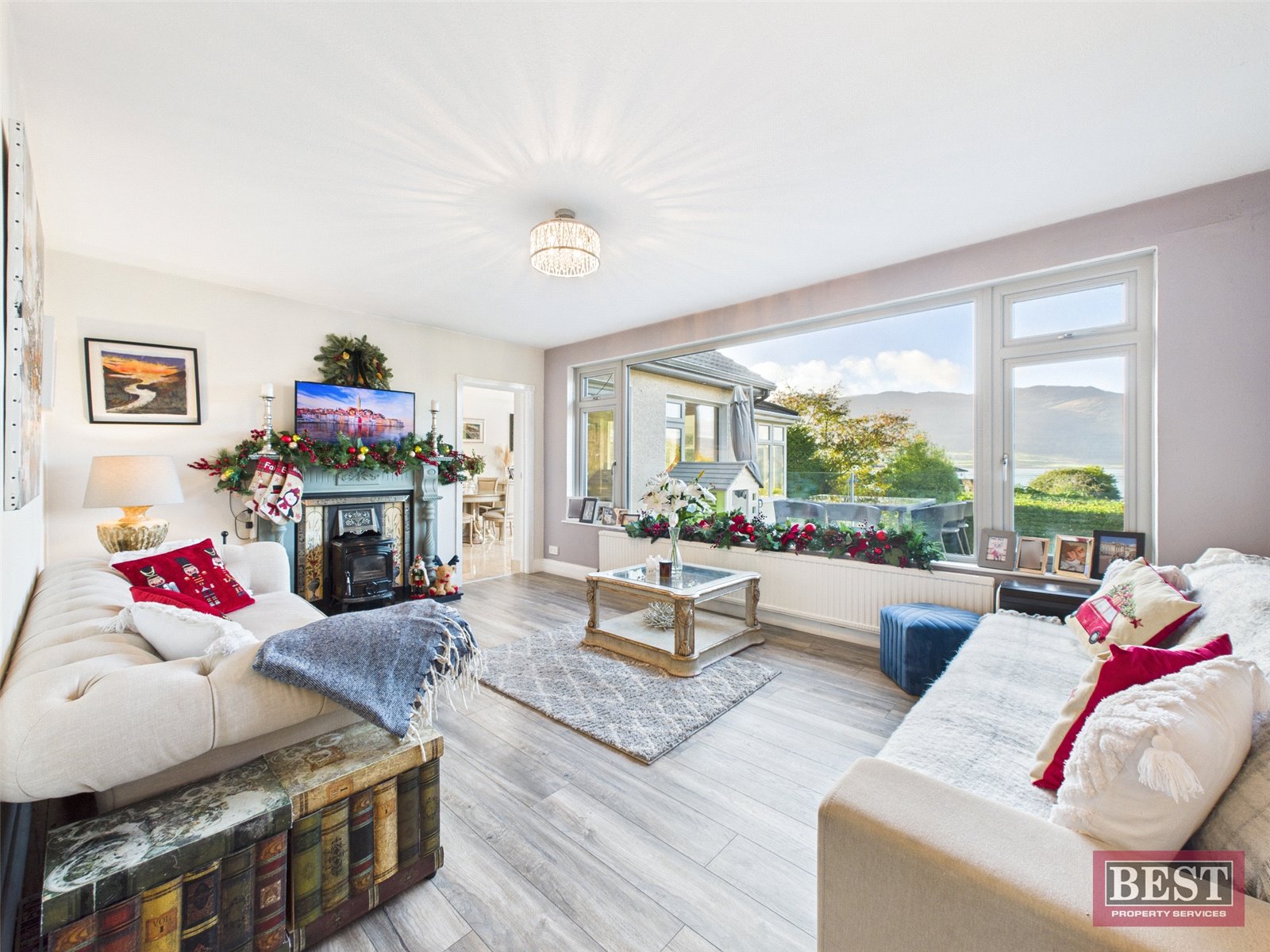 The spacious kitchen opens into a generous dining area with patio access. From here, you can walk through to a bright and airy sunroom with a recently fitted `CosyRoof´, perfectly positioned to enjoy the lough and mountain views. Off the dining room is a welcoming living room complete with a wood-burning stove and a large picture window framing the stunning scenery.