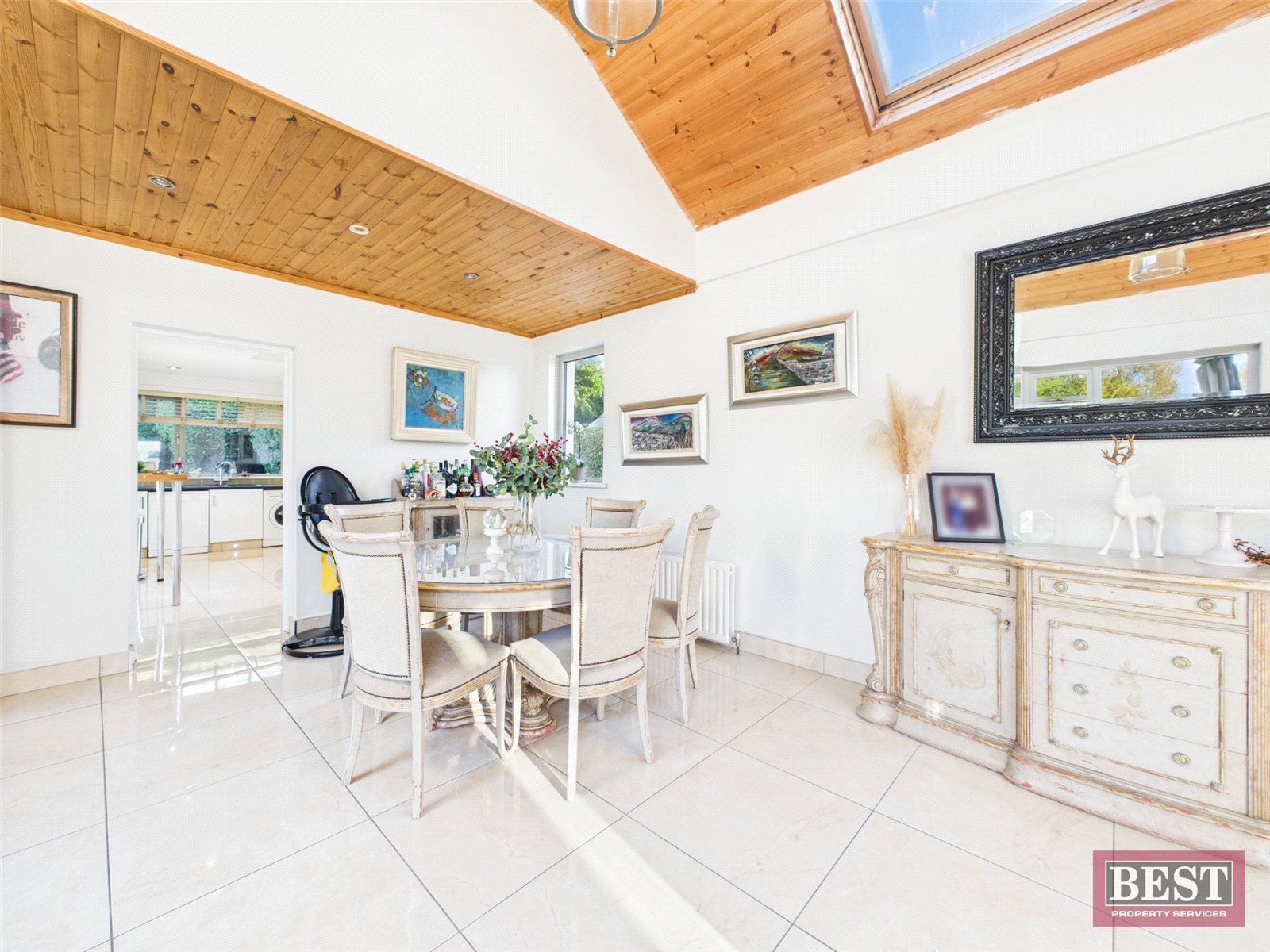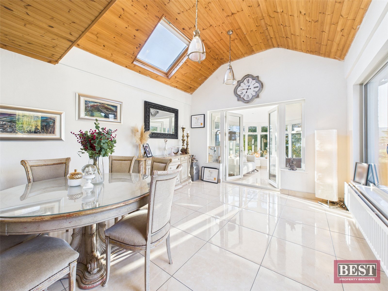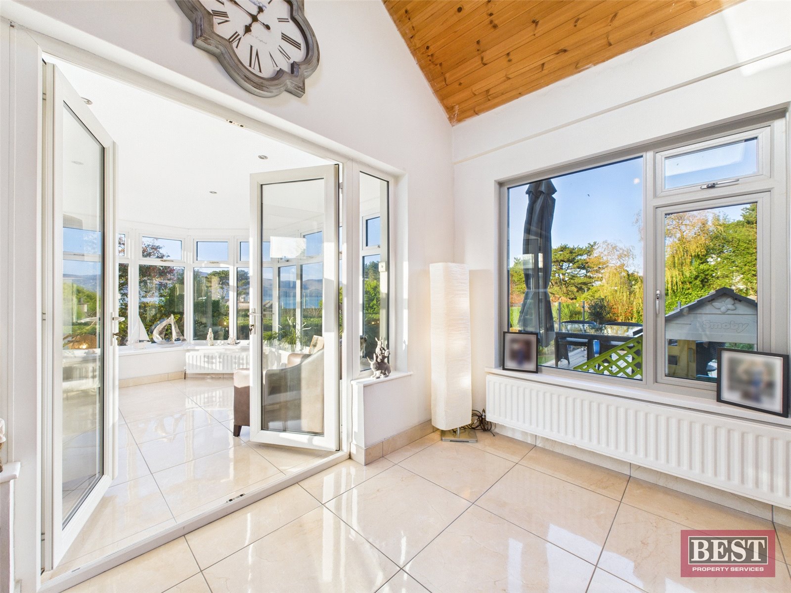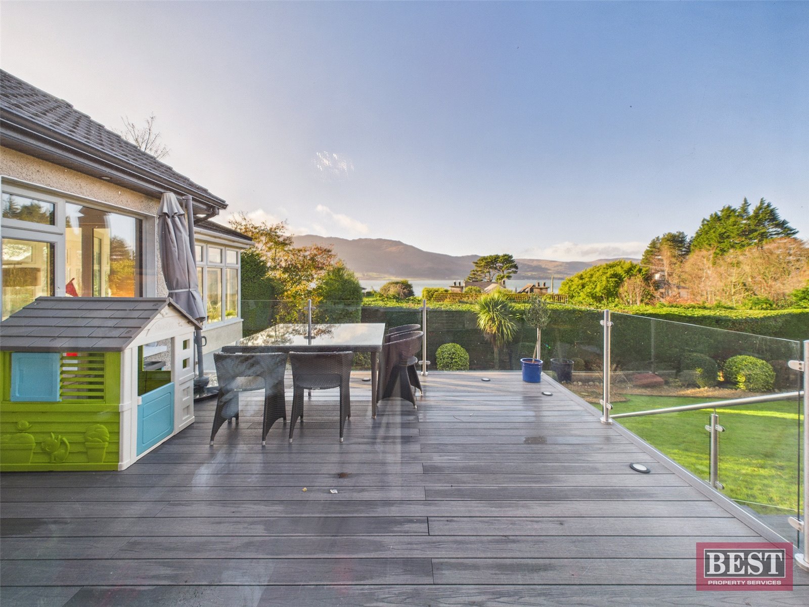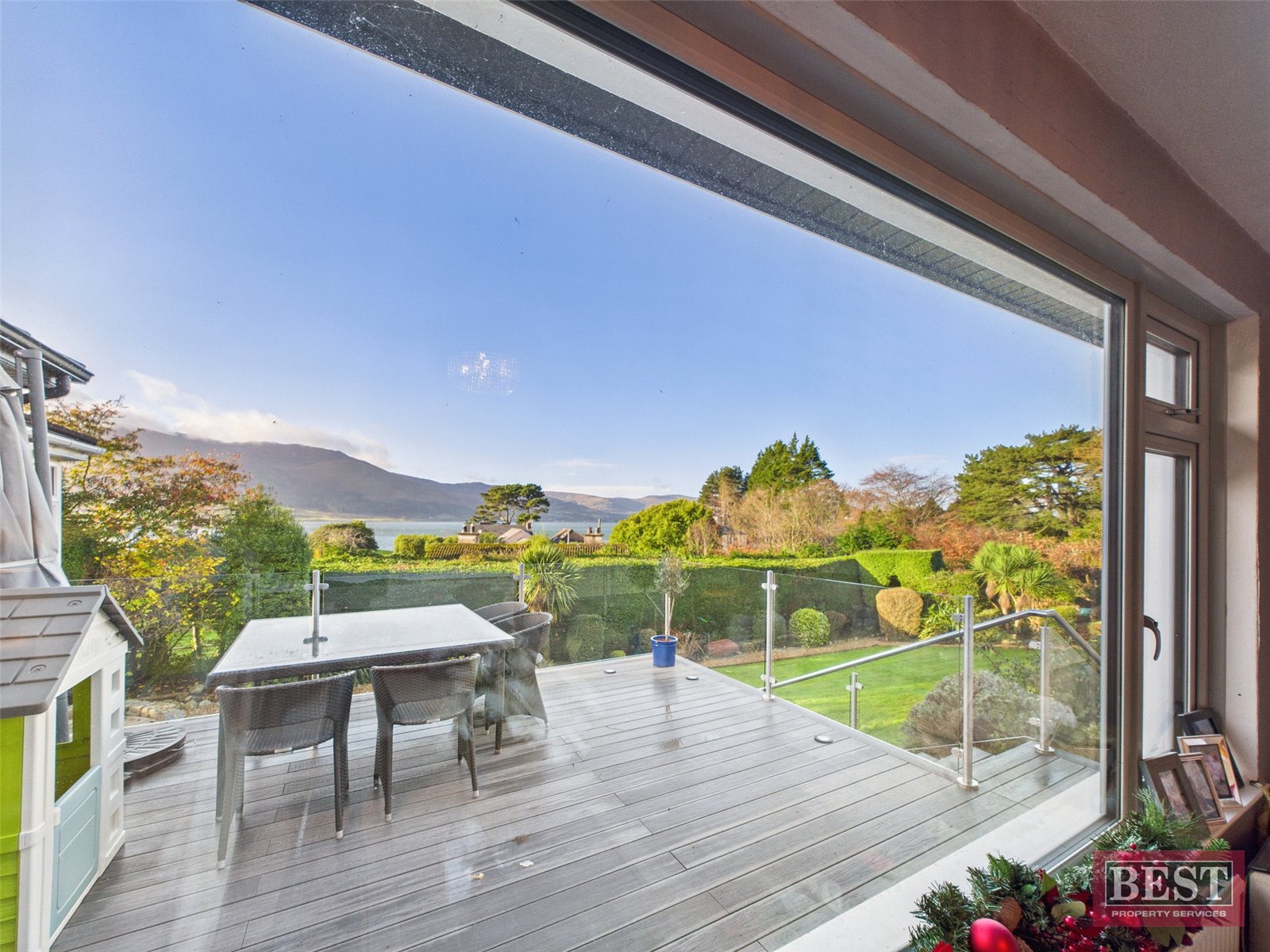The spacious kitchen opens into a generous dining area with patio access. From here, you can walk through to a bright and airy sunroom with a recently fitted `CosyRoof´, perfectly positioned to enjoy the lough and mountain views. Off the dining room is a welcoming living room complete with a wood-burning stove and a large picture window framing the stunning scenery.